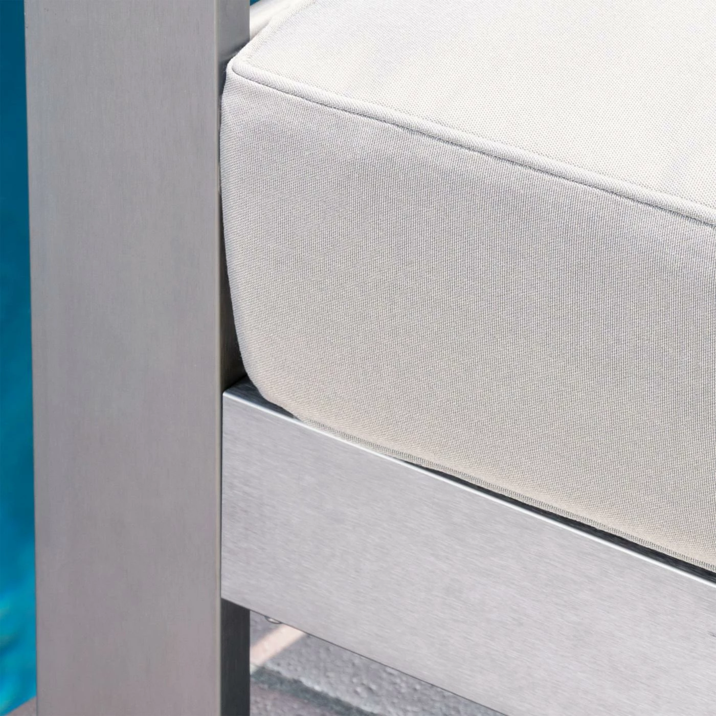 - Khaki-colored foam cushions with Sunbrella fabric covers