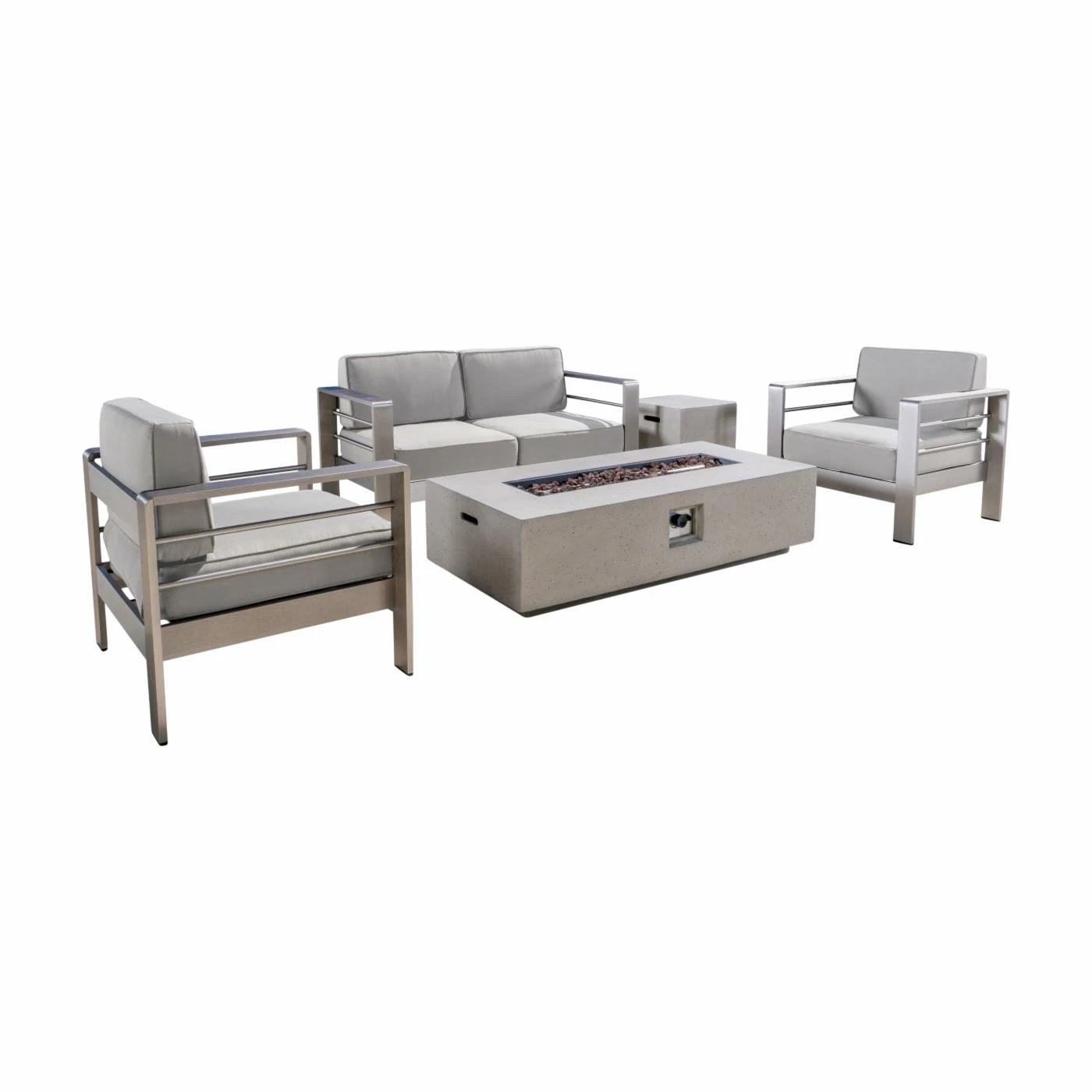 If you’re the kind of person who doesn’t do anything halfway, then you’ll love the way that the Cape Coral Aluminum 5 Piece Fire Pit Patio Conversation Set offers a bold, modern style that will transform your porch or patio. This set includes a fire pit table with a matching side table. Two chairs and a matching loveseat complete the set. The fire pit table is made from cast magnesium oxide with a rough, concrete-like texture. The fire pit is powered by a standard propane tank that’s hidden in the tank-holder/side table. Each of the chairs has a frame of rust-proof aluminum with a brushed, anodized finish. A khaki-colored Sunbrella fabric covers thick, foam-filled cushions that provide decadent comfort. Sunbrella fabrics are well-known for being resistant to mold, mildew, and UV-related fading.