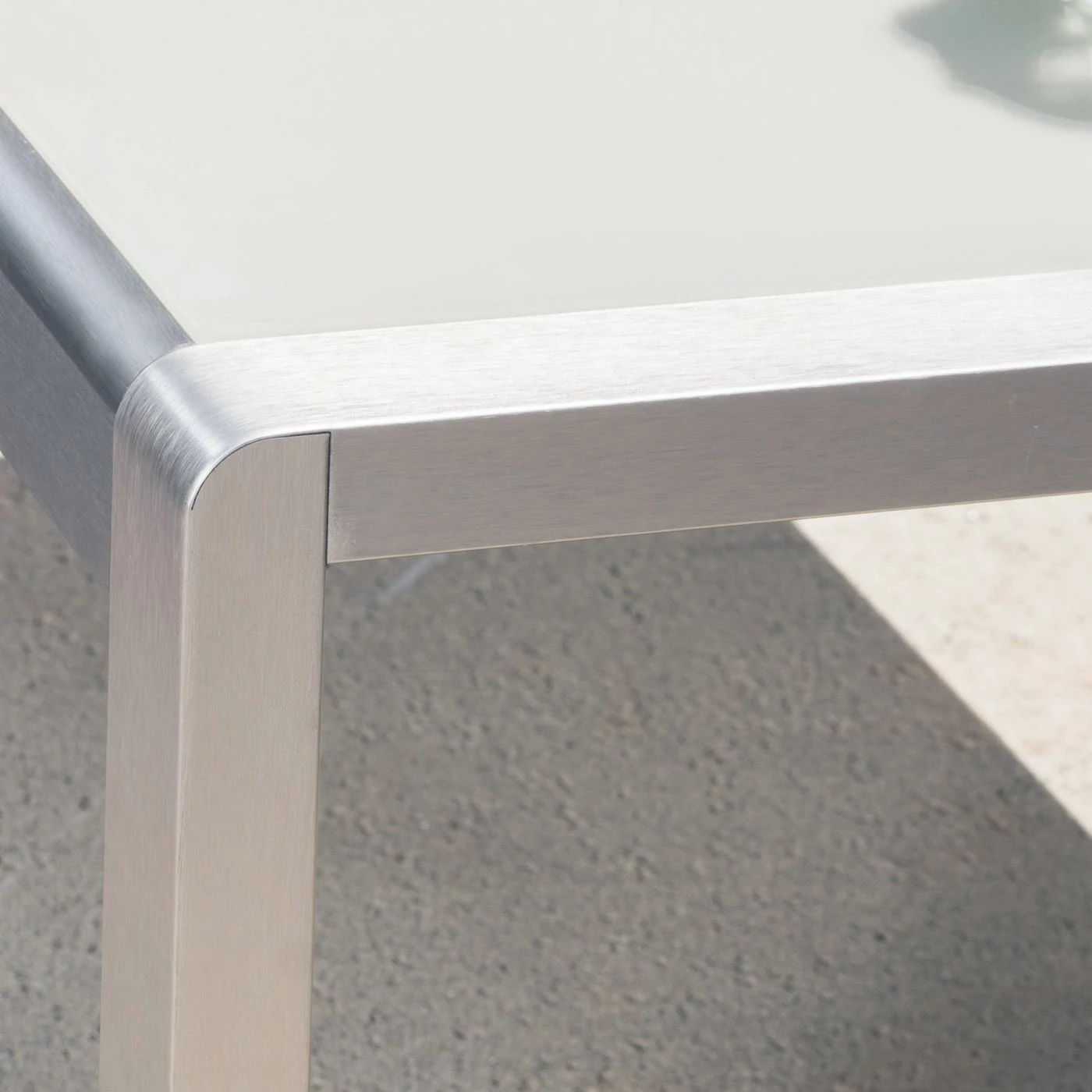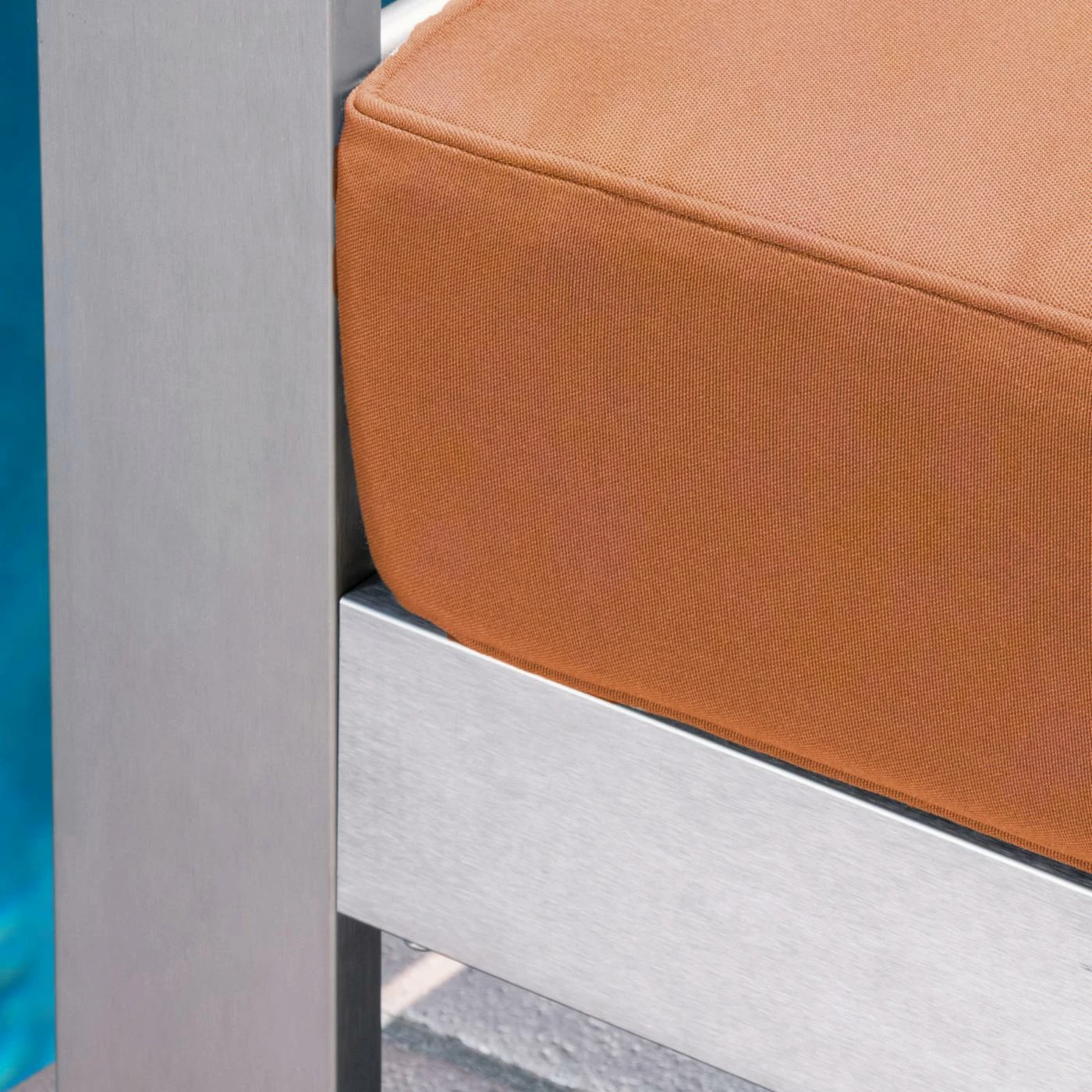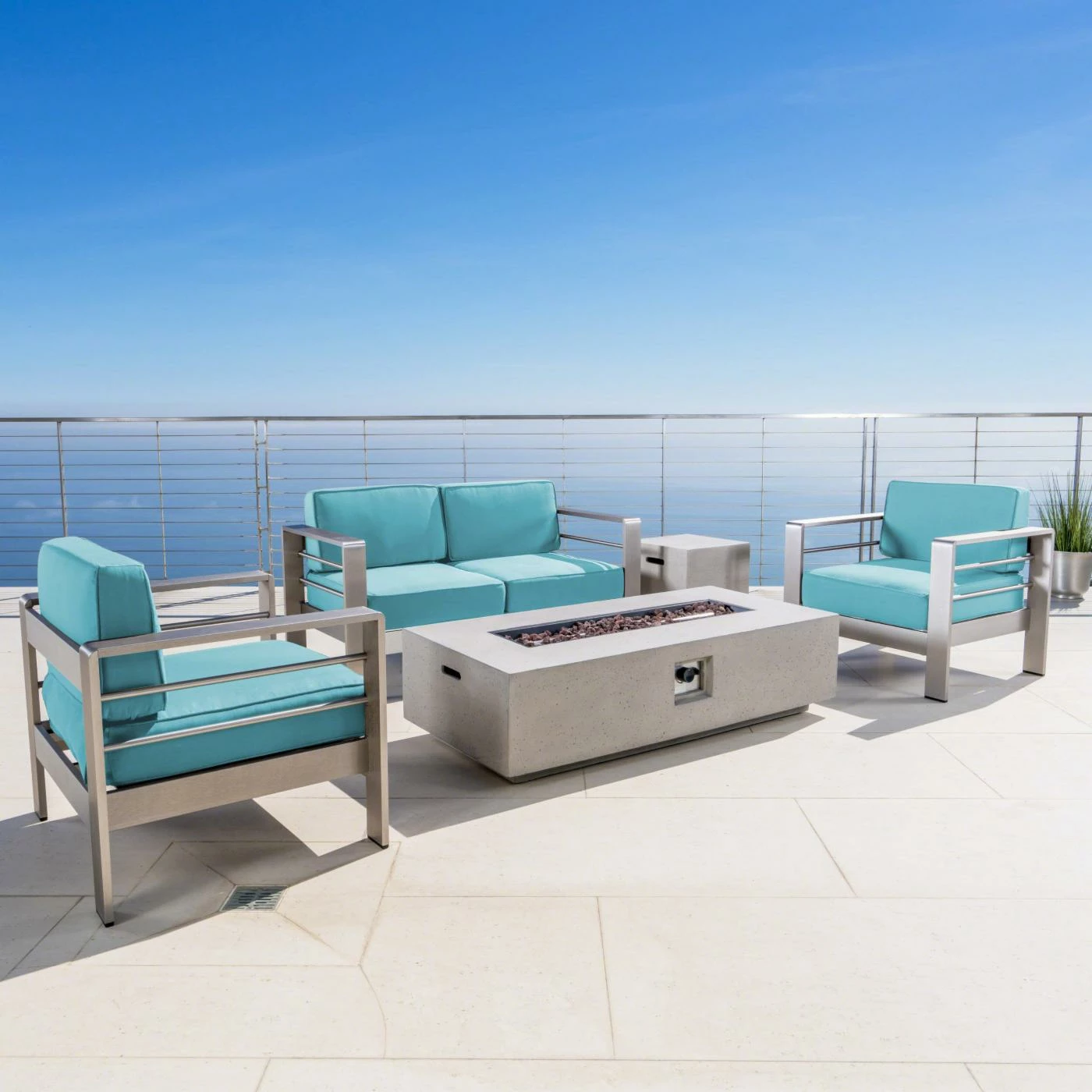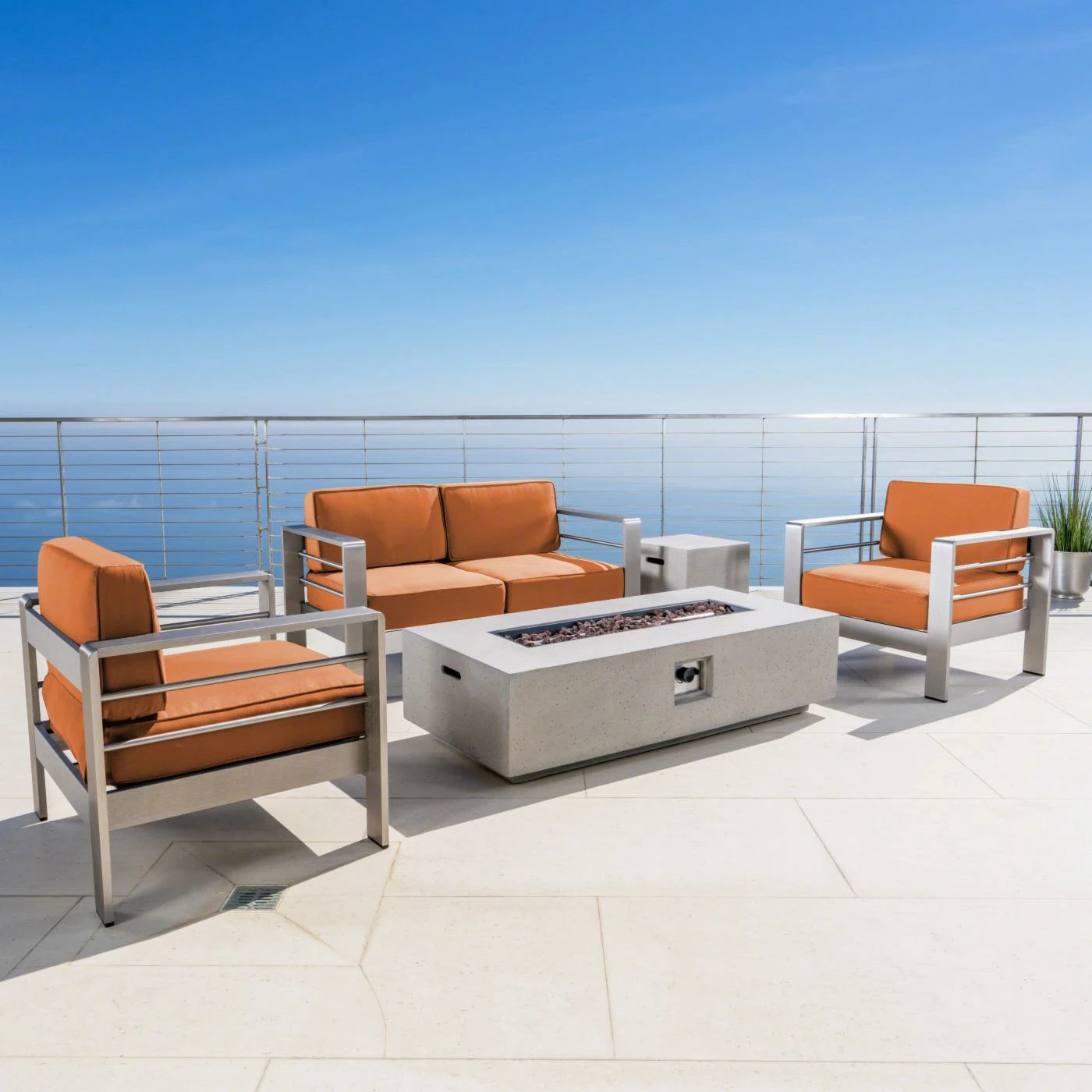 Make your outdoor space cozy and contemporary with the Cape Coral Aluminum 5 Piece Fire Pit Patio Set. This set includes a loveseat, two club chairs, a fire pit, and a tank holder. The seats feature aluminum frames in a brushed silver finish.ย The rectangular fire pit and square tank holder are made of heat-resistant magnesium oxide. Set will arrive with water-resistant khaki cusion covers. An additional set of of Sunbrella cushion covers, in your choice of colors, will ship separately and will be delivered within 3 business days.