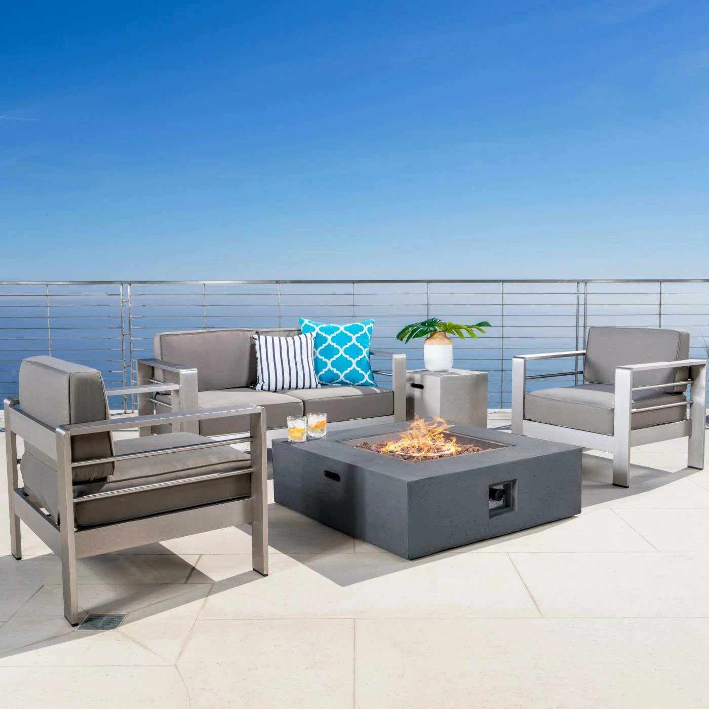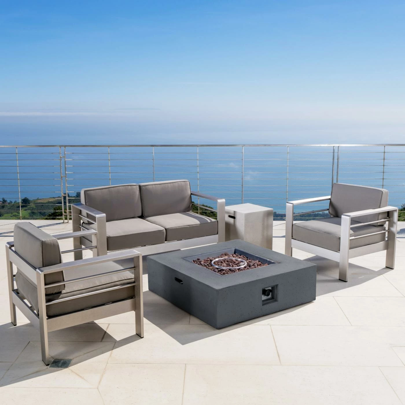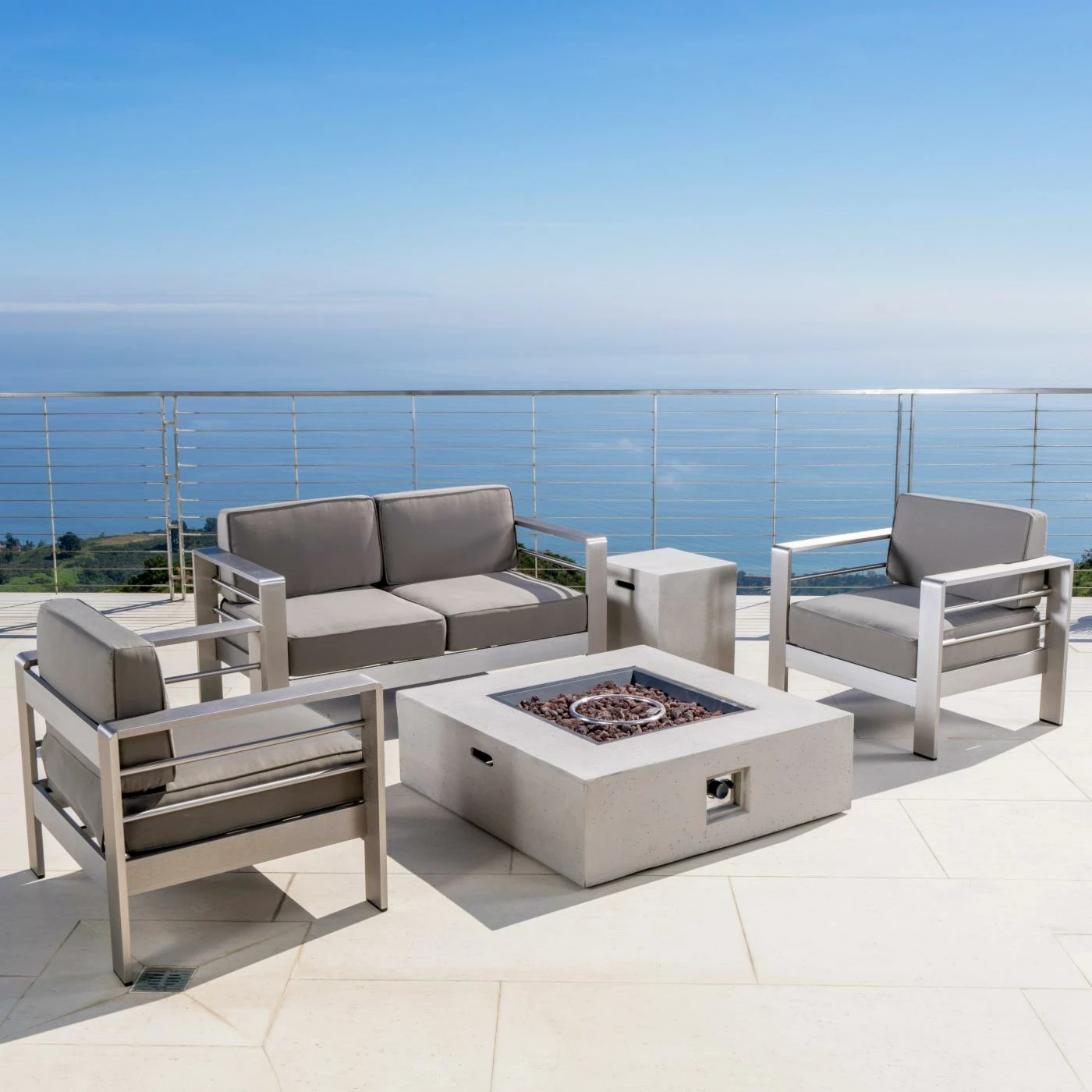 Outfit your outdoor space with the Cape Coral Aluminum 5 Piece Square Fire Pit Patio Set to create a warm, intimate space. This set includes a loveseat, two club chairs, a square fire pit, and a tank holder. The seats are durably constructed of aluminum in a brushed silver finish, and they’re topped with water-resistant polyester cushions for comfort. Choose from the available cushion colors to best coordinate with existing patio dรฉcor. The fire pit and tank holder are made of heat-resistant magnesium oxide. The tank holder can also function as an end table.