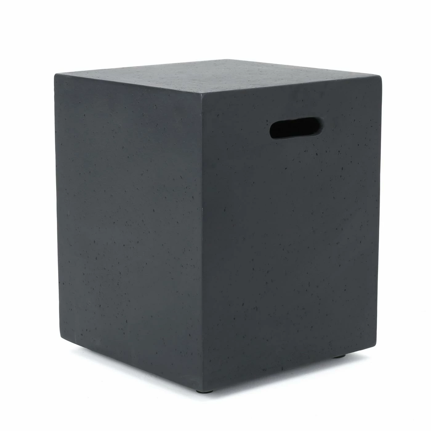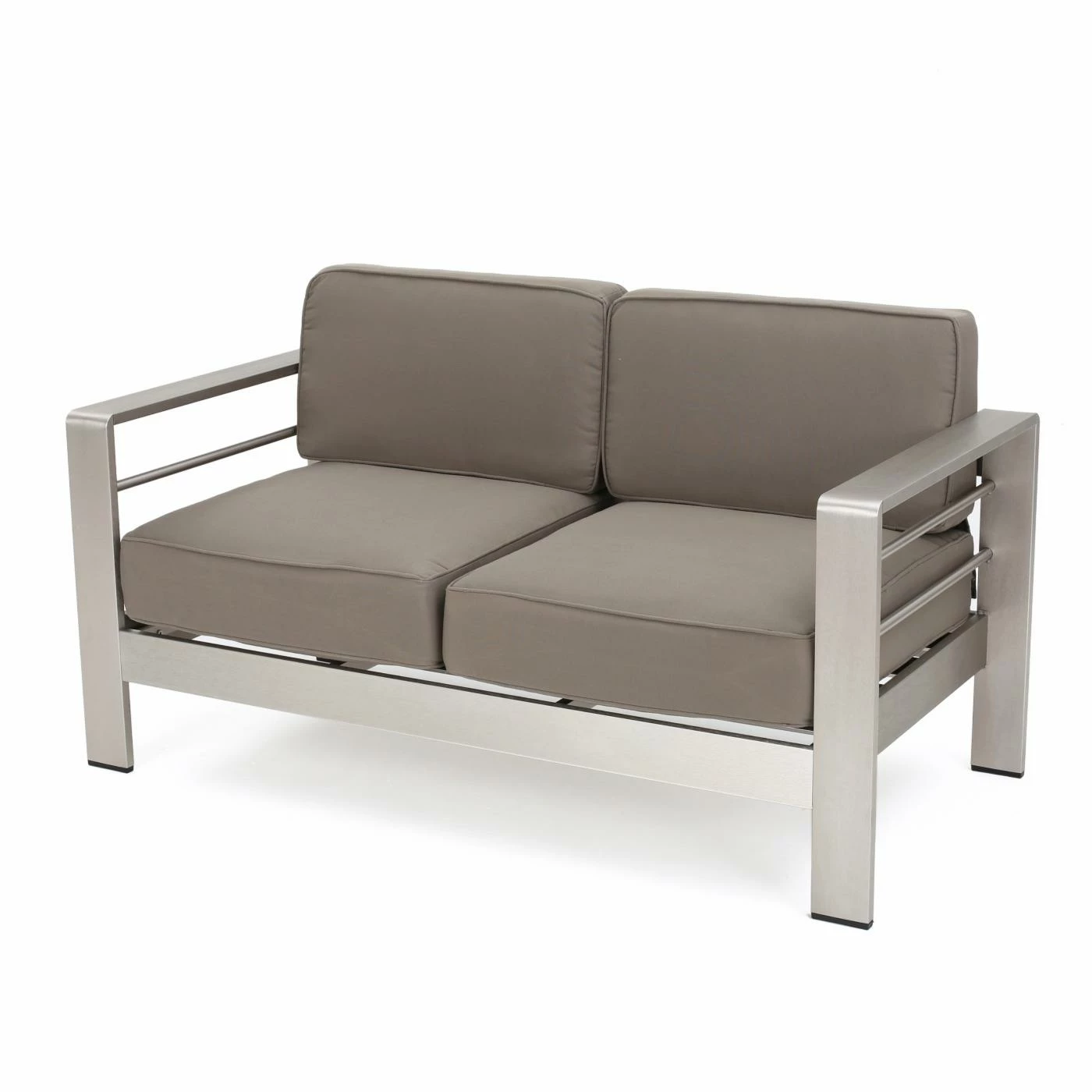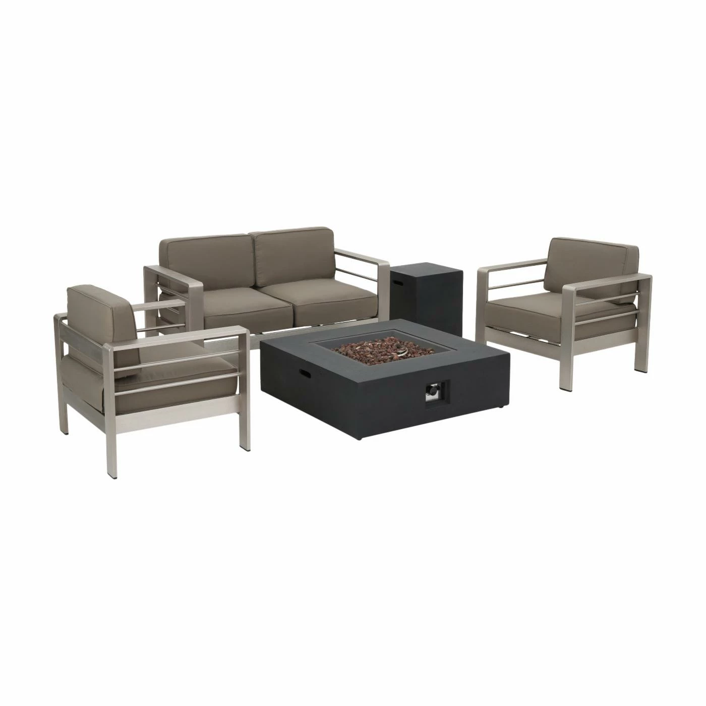 Outfit your outdoor space with the Cape Coral Aluminum 5 Piece Square Fire Pit Patio Set to create a warm, intimate space. This set includes a loveseat, two club chairs, a square fire pit, and a tank holder. The seats are durably constructed of aluminum in a brushed silver finish, and they’re topped with water-resistant polyester cushions for comfort. Choose from the available cushion colors to best coordinate with existing patio dรฉcor. The fire pit and tank holder are made of heat-resistant magnesium oxide. The tank holder can also function as an end table.