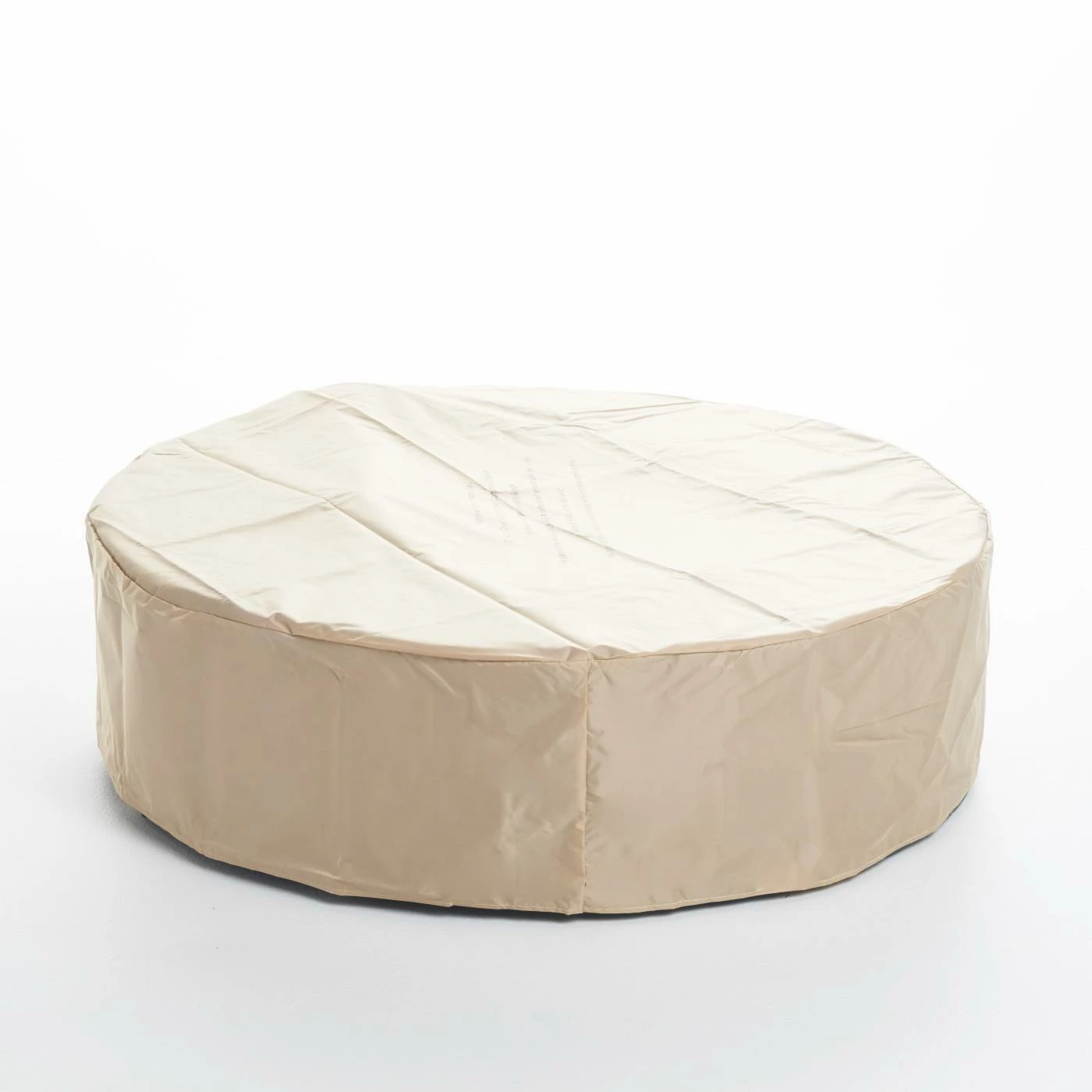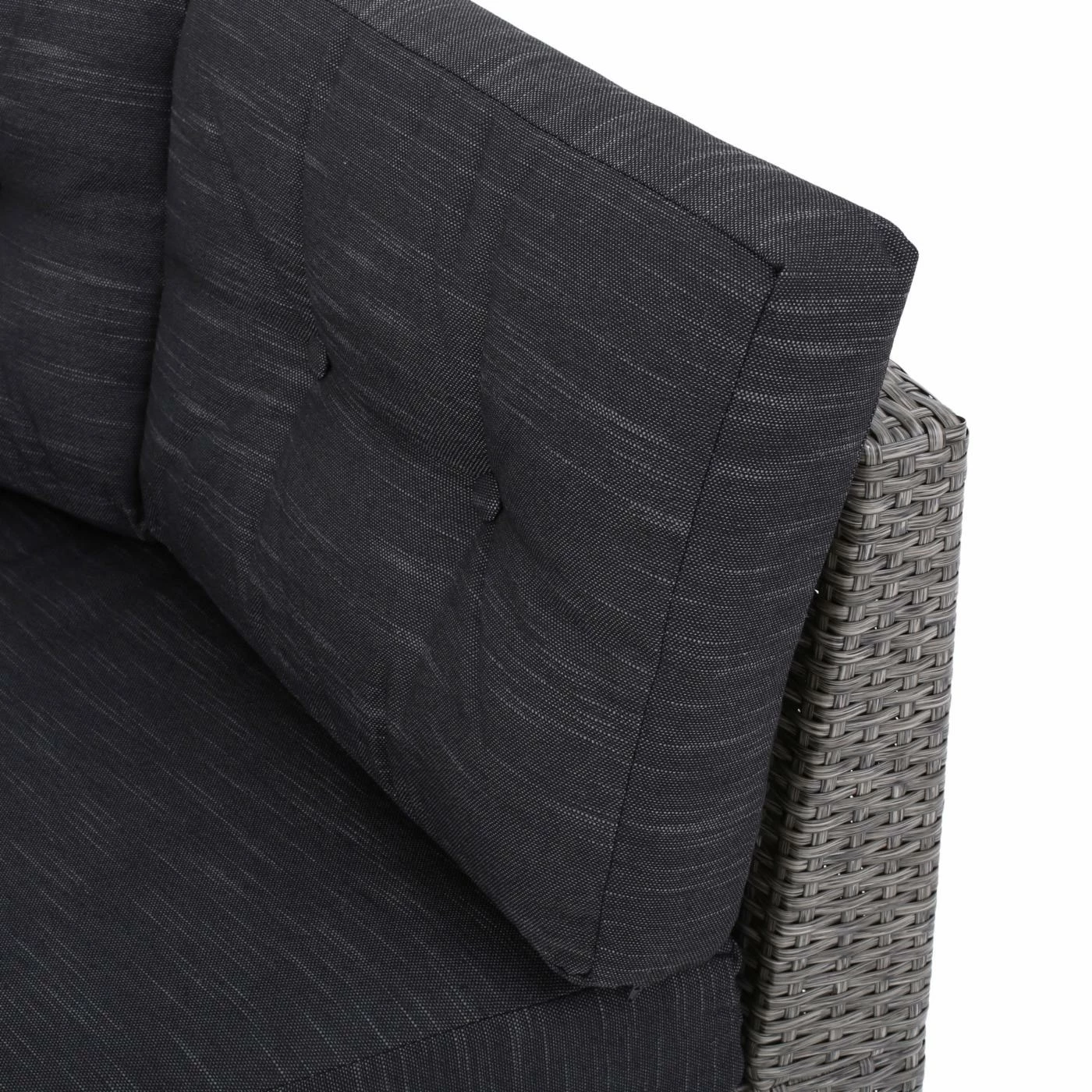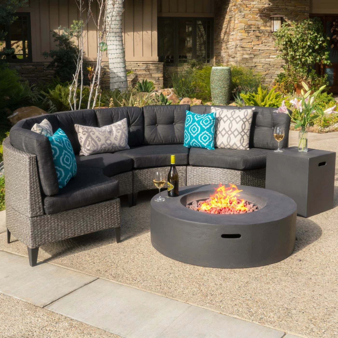 Together, the pieces of the Navagio Wicker 6 Piece Half Round Fire Pit Patio Set creates a warm, cozy outdoor arrangement. The curved sectional wraps around the round fire pit, and off to the side, the tank holder also functions as an end table. The sectional is made of polyethylene wicker and topped with polyester seat and back cushions. The fire pit and tank holder are durably constructed of magnesium oxide in your choice of available finishes. Tapered legs, button-tufted back cushions, and neutral colors give this set a transitional look that’s easy to pair with your outdoor dรฉcor.