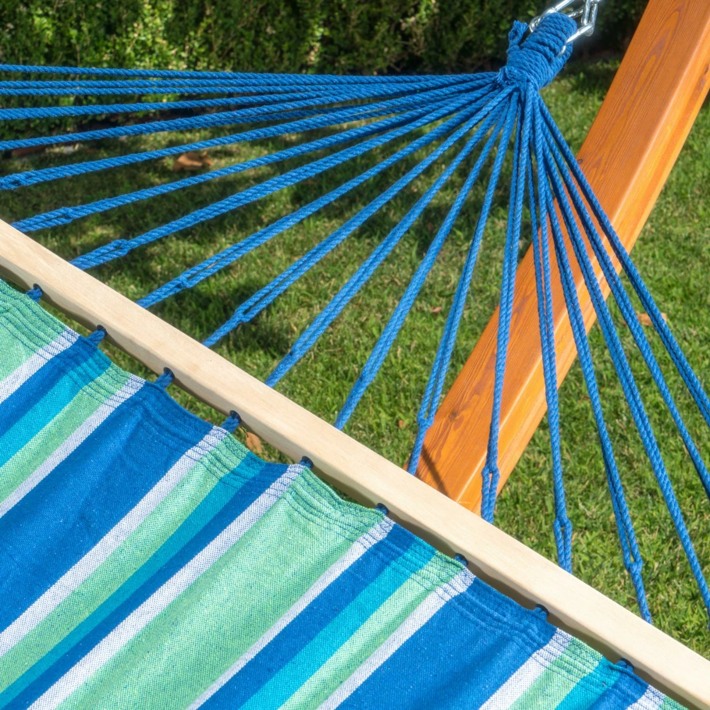 The Richardson 6.75 ft. Fabric HammockΒ comes in your choice of available colors, so you’ll be sure to find one that will match your style. The Sunbrella fabric is 100% polyester and includes reinforced stitching. The hammock fabric has a weight capacity of 400 lbs. and does not require any assembly. Stand is not included.