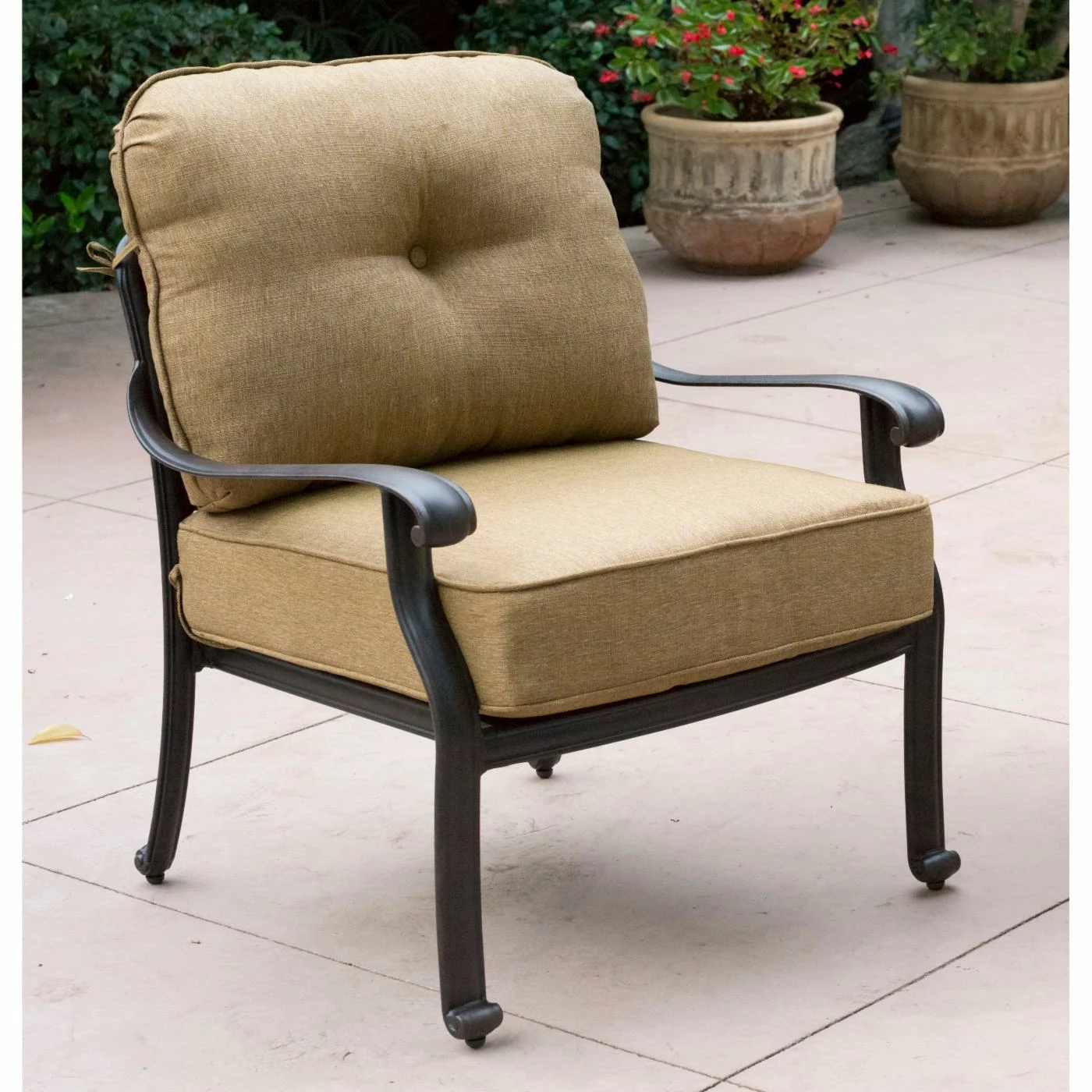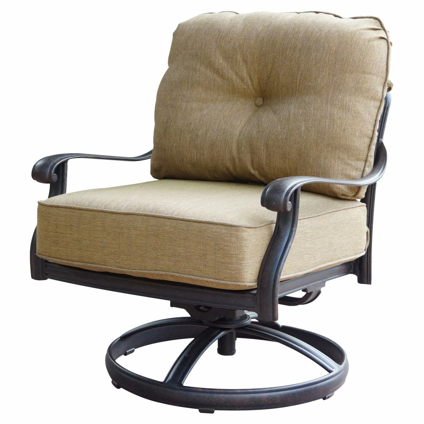 The Darlee Elizabeth 5 Piece Aluminum Deep Seating Fire Pit Patio Set is going to be where you gather from the first warm day of spring until you’re all bundled up and roasting marshmallows over the fire pit. This set includes a pair of wide arm chairs, two swivel-rockers, and a matching coffee table that’s ready for anything. Each piece offers a fully welded frame that’s built from cast aluminum with a powder-coated finish of antique bronze. The combination of the aluminum body and the bronze finish give each piece the look of vintage wrought-iron furniture. At the center of the table is a circular opening that includes a variety of different accessories. You can insert the stainless steel ice bucket to cool off drinks in the summer, or you can install the propane-powered fire pit so you can gather around a familiar, flickering flame. You even have a barbeque insert that lets you do a bit of grilling. No matter which you choose, you can relax easily in chairs that offer a deep, spacious seat appointed with extra-thick foam cushions. The removable cushions are covered in all-weather polyester fabric in a complementary shade of sesame. The wide bases of the chairs allow you to take advantage of the smooth-moving swivel-rocking mechanism while you survey your patio or poolside.