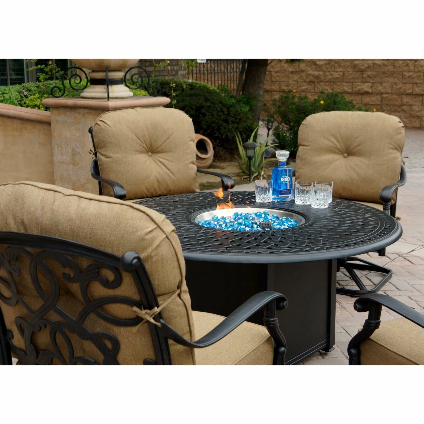The Darlee Santa Monica 5 Piece Swivel Chair Propane Fire Pit Conversation Set will be an enhancement to any outdoor entertainment area. The chairs swivel and rock and have thick cushions for your comfort. Fire pit table includes ocean blue fire glass which will give your backyard the beauty it deserves. You will have plenty of space for snacks and drinks. All the pieces are cast aluminum and have a rich antique bronze finish.