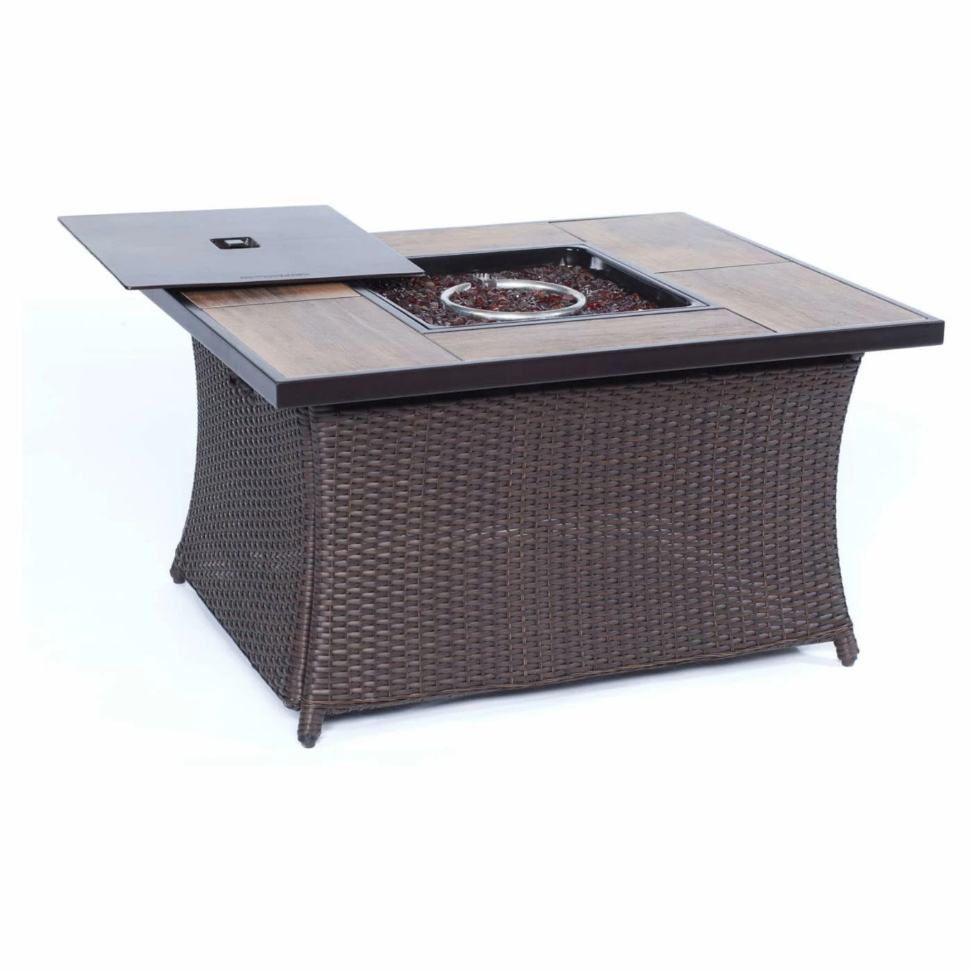 Make your outdoor living space cozy with the Hanover Orleans 4 Piece Wicker Fire Pit Conversation Set. This deep-seating set includes two cushioned swivel rockers, a cushioned sofa, and a convertible fire pit table. Pieces boast rust-resistant aluminum frames hand-woven with all-weather resin wicker in a French roast color. Swivel rockers feature smooth 360-degree swivel motion for easy conversation and springs for a gentle rock. The sofa seats three in comfort. Thick foam seat and back cushions are available in a range of all-weather polyester color options. Accent pillows add panache. The convertible fire pit cocktail table features a generous top available in select materials. It includes decorative lava rocks and a removable lid to utilize the entire top when not being used as a fire pit. This fire pit outputs 40,000 BTUs for cozy warmth.