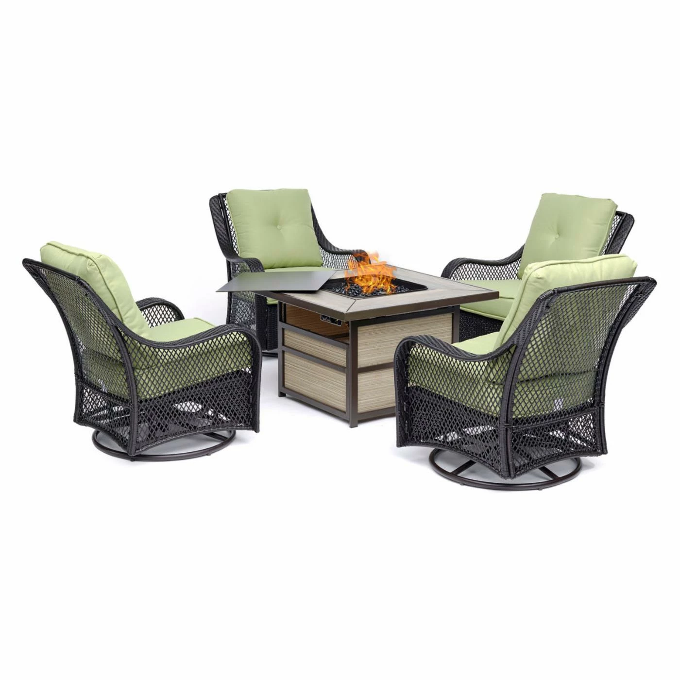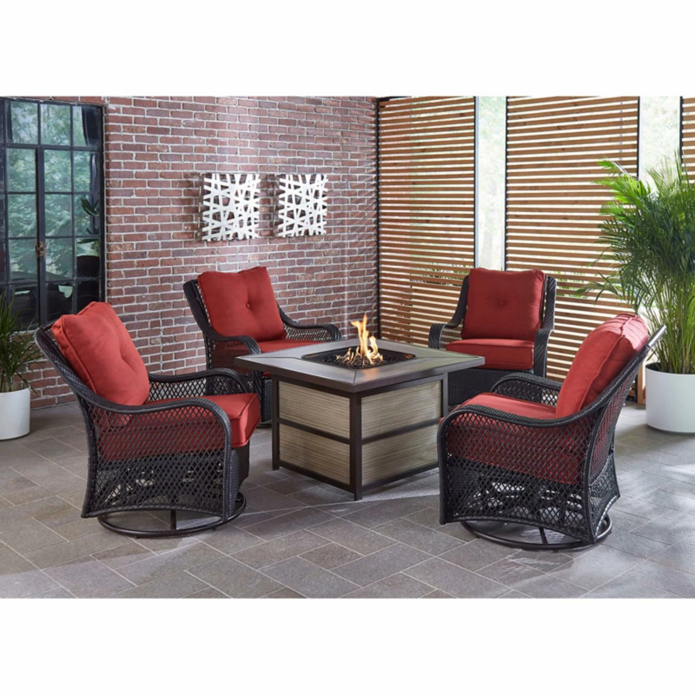 The Hanover Orleans Wicker Fire Pit Patio Chat Set is the picture of easy elegance. Centered on a warming square fire pit table, this transitional set includes four deep-seated, swivel-based gliding chairs that are framed in weather-resistant aluminum and wrapped with durable synthetic woven wicker. The hand-crafted chairs get air from delicate, openwork side panels, while the curved armrests and sloped aprons are comfortable. The overall deep brown finish is timeless, and the entire high-tensile set resists UV fading, staining, and cracking.