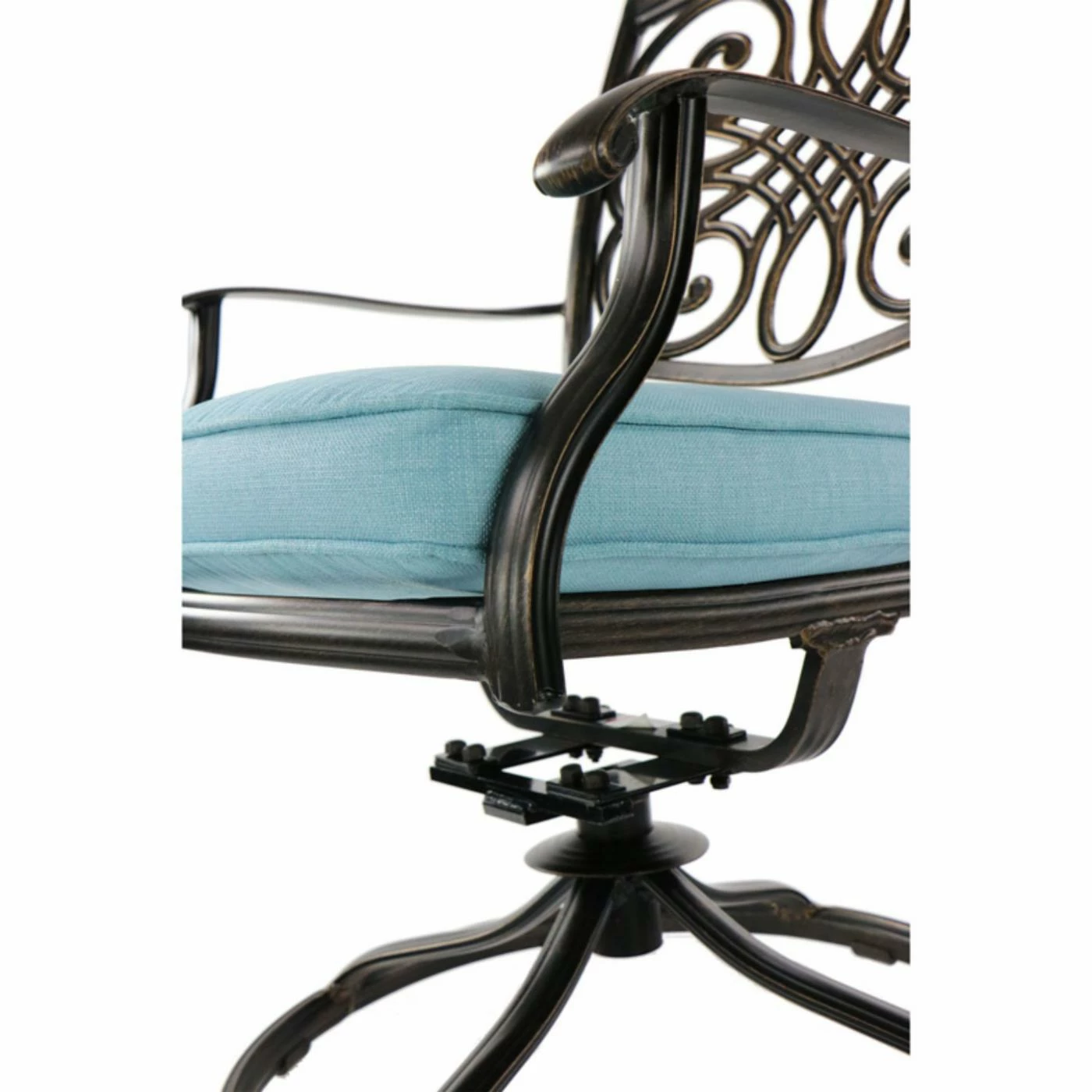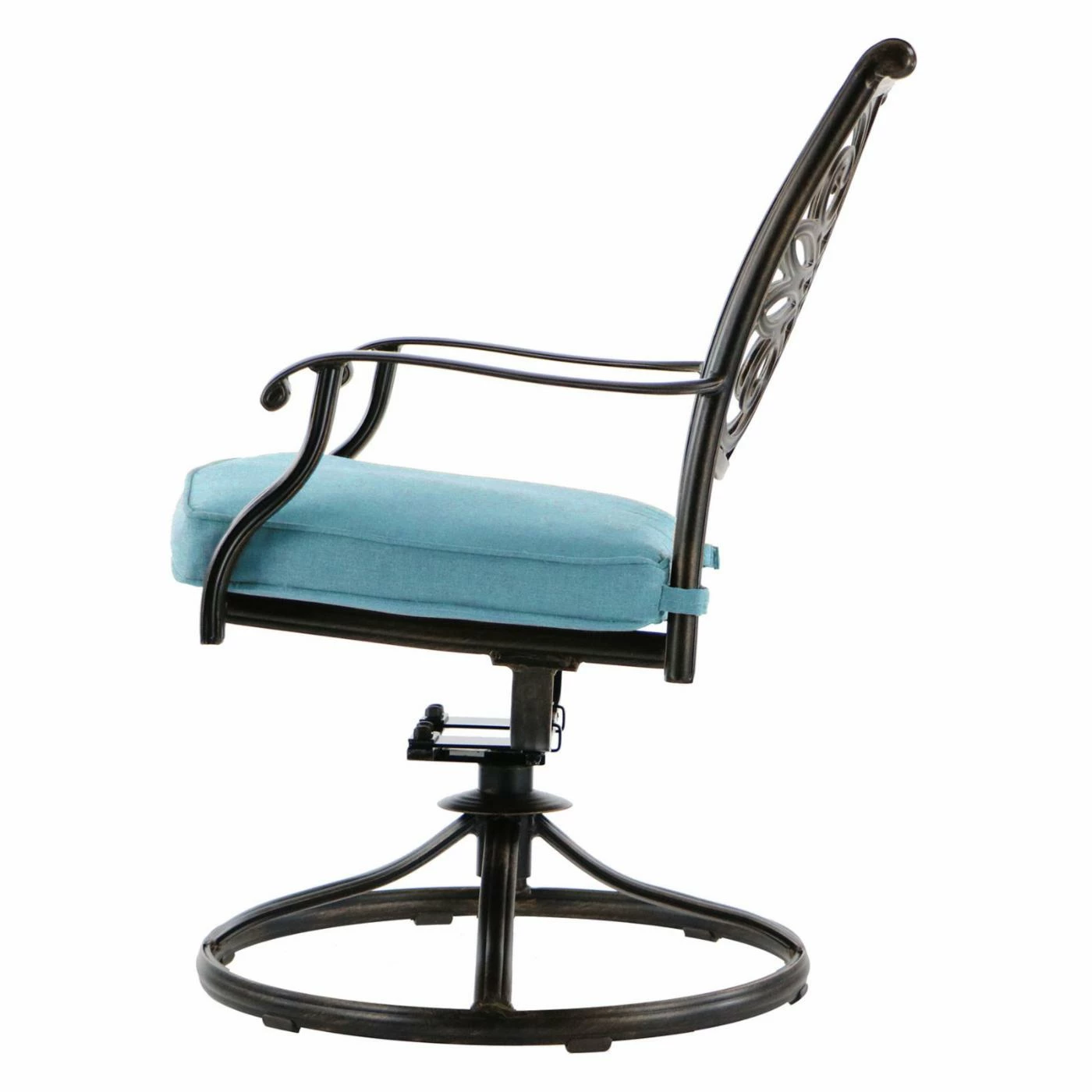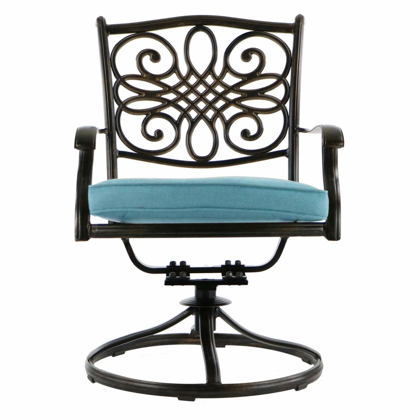 Start your own family traditions when gathered around the Hanover Traditions Aluminum Square Fire Pit Patio Chat Set. This richly designed traditional outdoor set places four swivel rockers around a cozy square fire pit table. Each piece is framed in durable, rust-resistant aluminum. The chairsโ high backs boast artful open scrollwork, while plump cushions with foam cores pad the seats for wonderful comfort. Choose from the available cushion color options; each is rendered with premium outdoor fabric that resists UV rays, moisture, and staining. The 40,000 BTU fire pit table has a cleverly concealed tank chamber (tank not included). The easy-to-use control panel lets you tailor heat output to your preference. A manufacturerโs one-year limited warranty is included. Assembly is required.