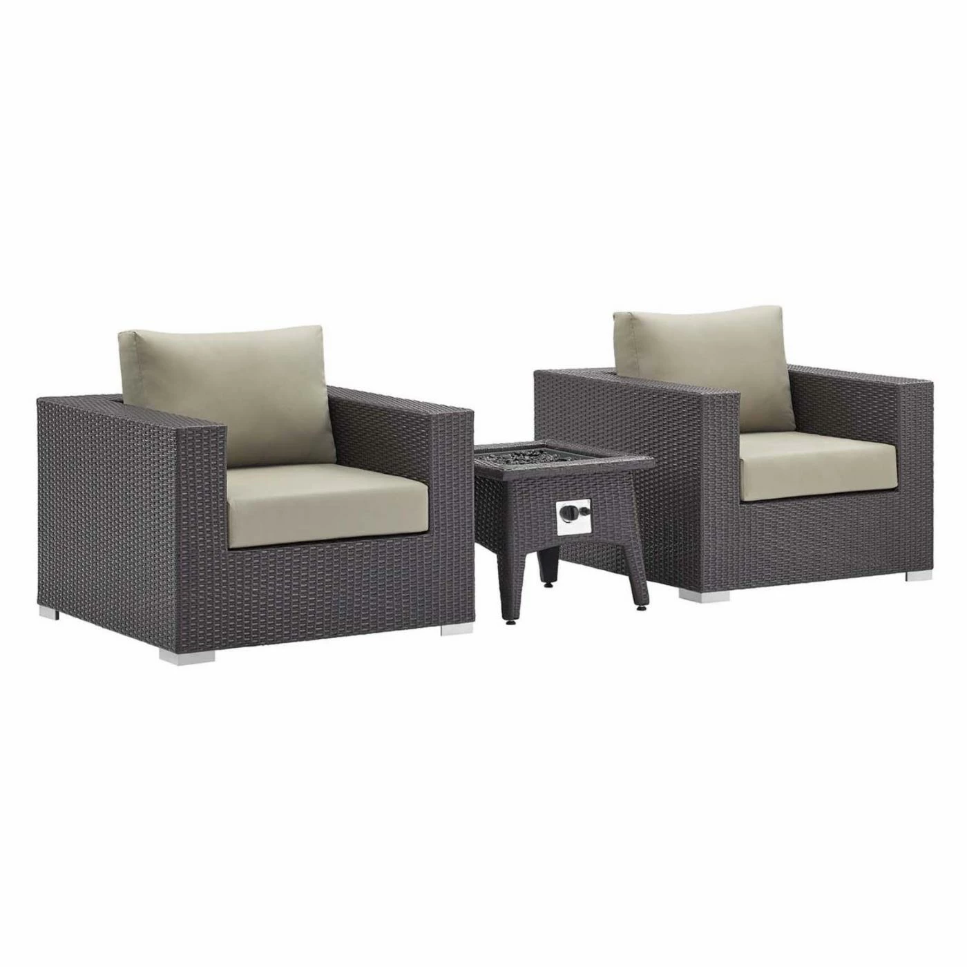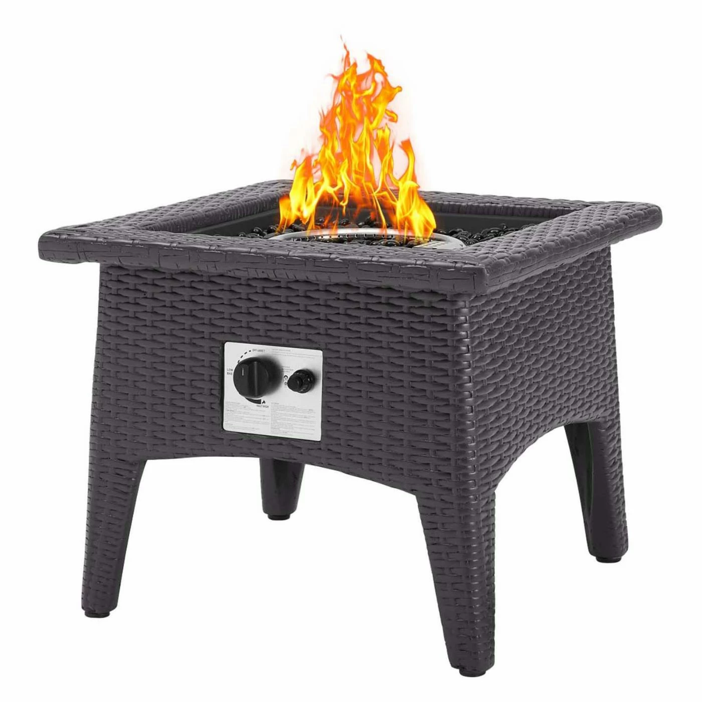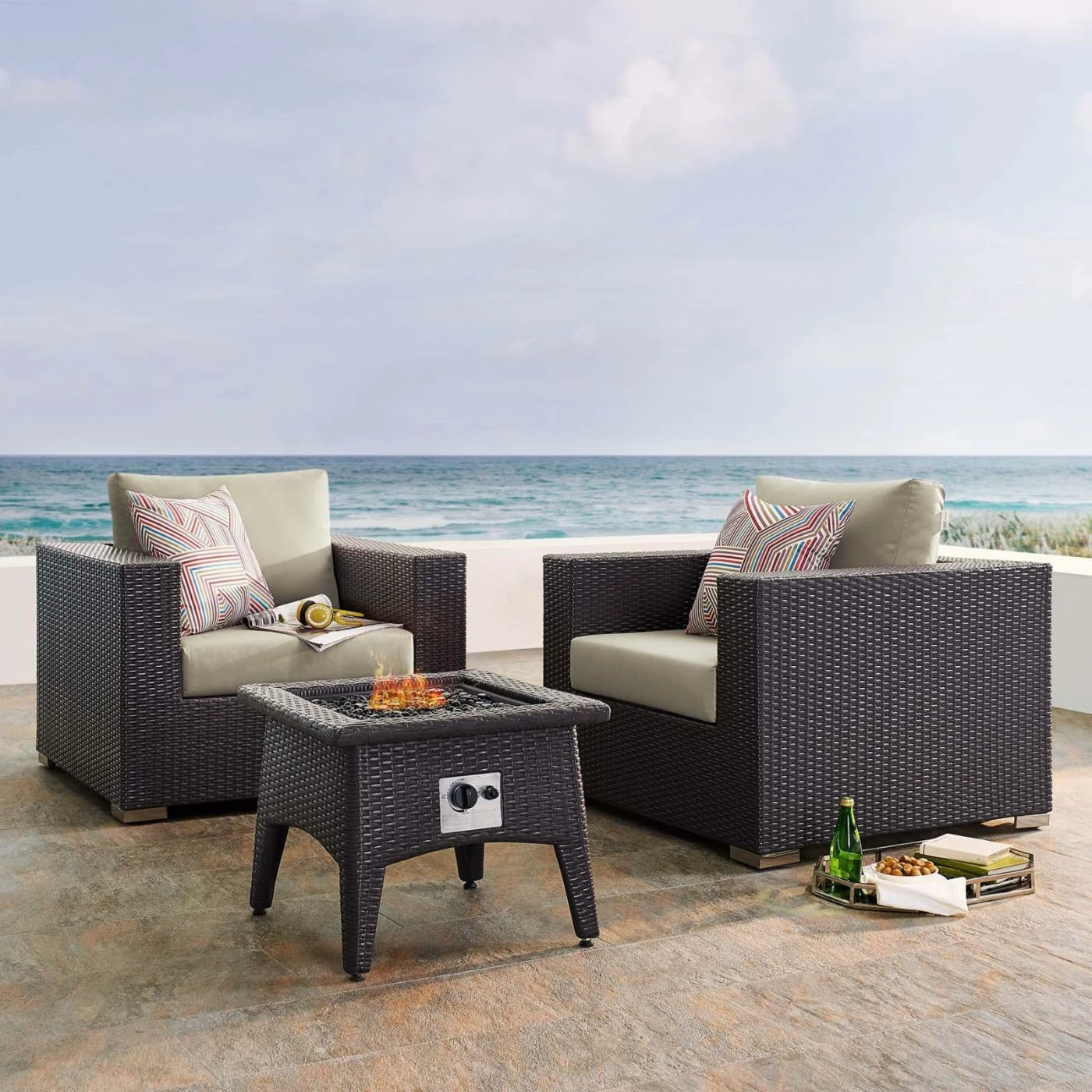 Transform that empty patch of lawn into a little oasis all to yourself with the Modway Convene 3 Piece Outdoor Patio Set with Fire Pit. This set features a fire-table and two matching armchairs, each built for outdoor use. The table has a stainless-steel burner with a one-touch spark-ignition switch for instant flames. Fire rocks are included to conceal the burner. Every piece is made from aluminum wit block feet and a powder-coated finish. A shell of espresso brown wicker tops the frames, resistant to rain and sun. Waterproof, foam-padded seat cushions offer ample comfort at you enjoy your evening cocktails. Choose among the available fabric colors to give the set your own personal stamp.