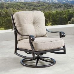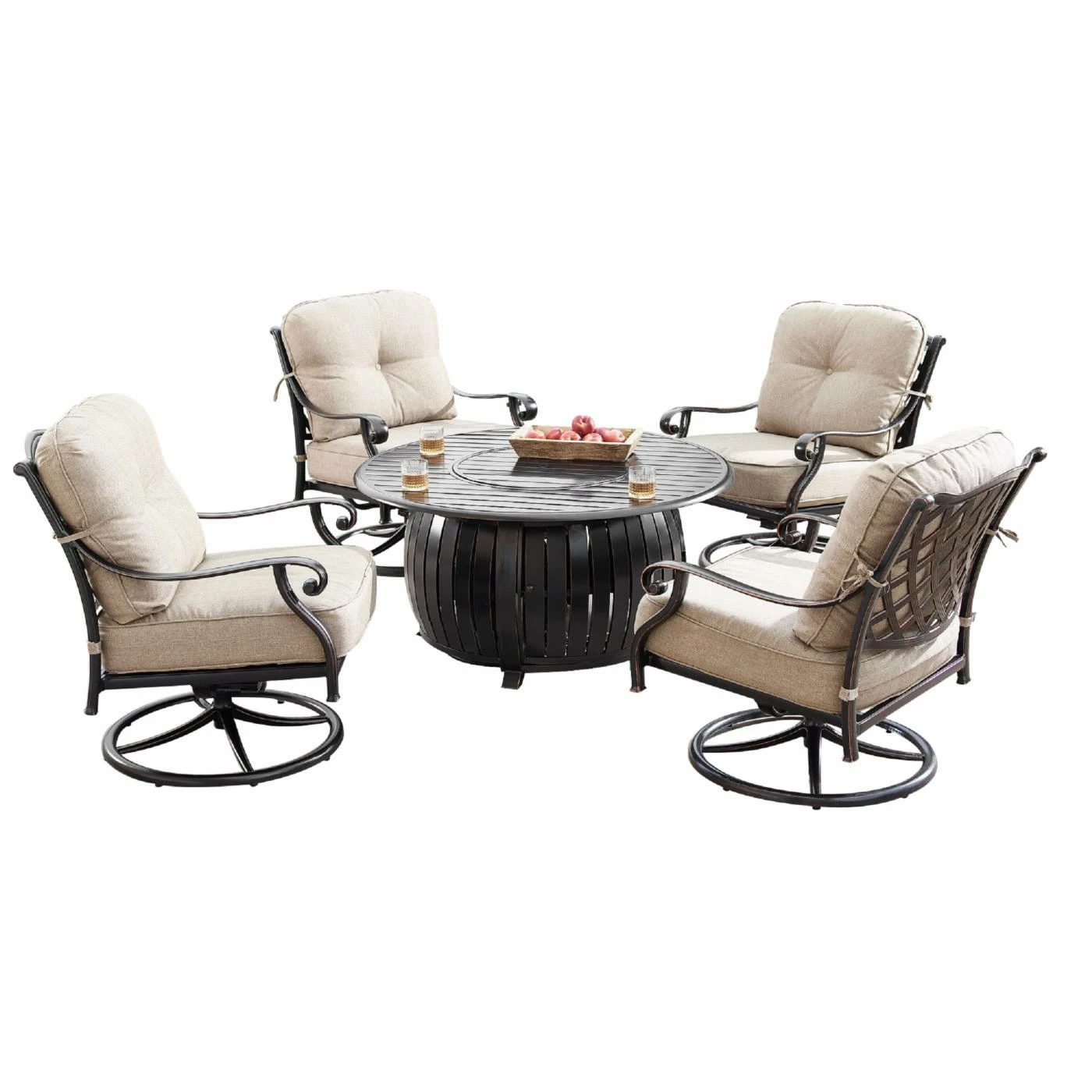 Whether your outdoor retreat is located in the mountains, on the coast, or somewhere in between, the Oakland Living Finland Italy Aluminum 5 Piece Propane Fire Pit Chat Set will extend your evenings with friends and family around the fire. With this addition you can enhance your outdoor setting with even more ambiance and relaxation. This fire table set comes with an Outdoor Aluminum 44 in. Round Fire Table Set, Four Deep Seating Swivel Rocking Chairs, Fire Beads, Lid and Fabric Cover.
