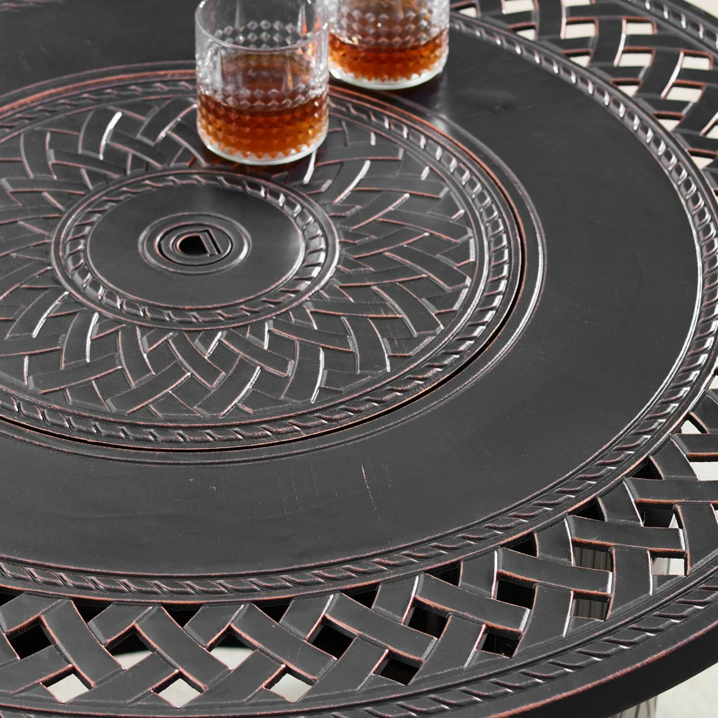 Whether your outdoor retreat is located in the mountains, on the coast, or somewhere in between, the Oakland Living Finland Ritz Aluminum 5 Piece Propane Fire Pit Chat Set will extend your evenings with friends and family around the fire.ย With this addition you can enhance your outdoor setting with even more ambiance and relaxation. This fire table set comes with an Outdoor Aluminum 34 in. Round Fire Table Set, Four Deep Seating Swivel Rocking Chairs, Fire Beads, Lid and Fabric Cover.
