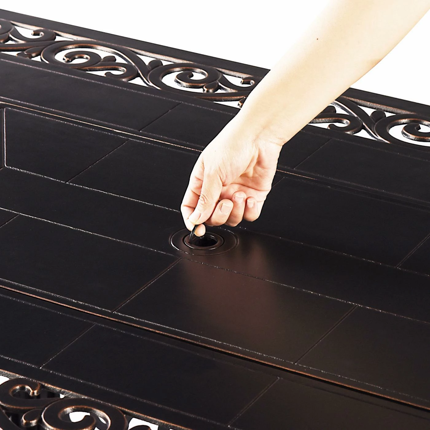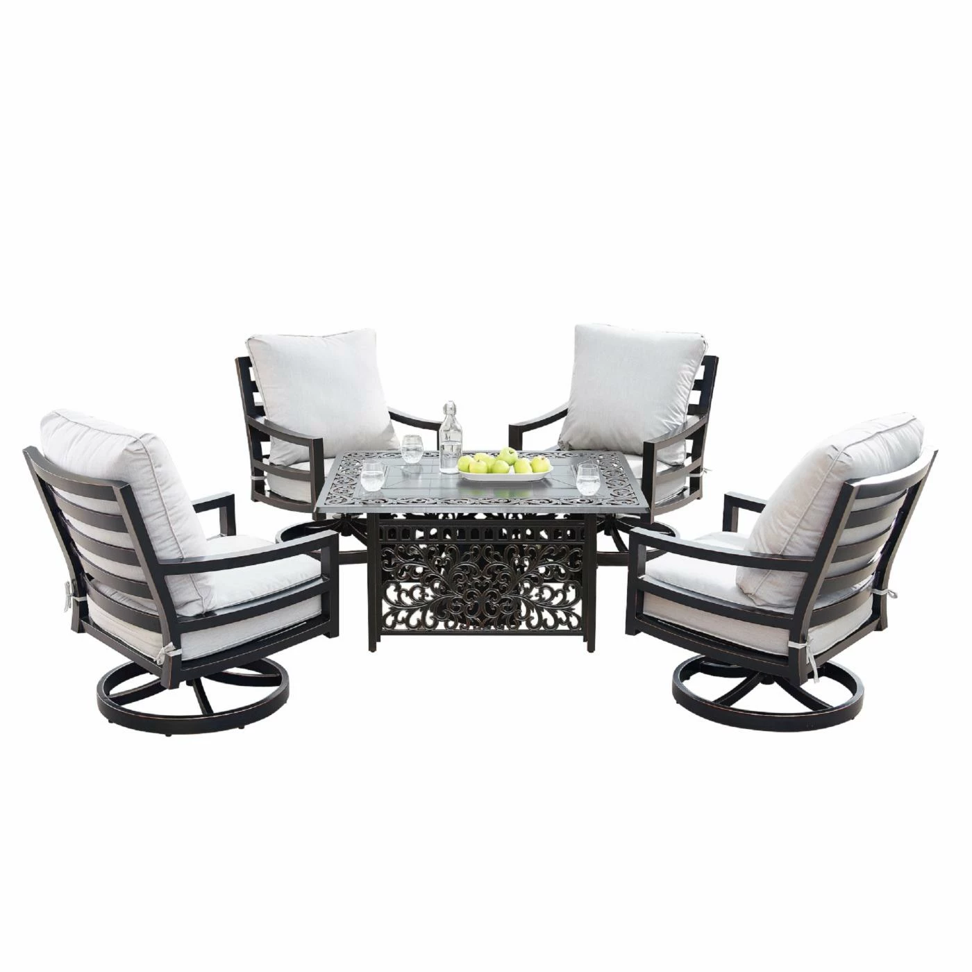 Whether your outdoor retreat is located in the mountains, on the coast, or somewhere in between, the Oakland Living Hudson Cabos Aluminum 5 Piece Propane Fire Pit Chat Set will extend your evenings with friends and family around the fire.ย With this addition you can enhance your outdoor setting with even more ambiance and relaxation. This fire table set comes with an Outdoor Aluminum 48 in. Rectangular Fire Table Set, Four Deep Seating Swivel Rocking Chairs, Fire Beads, Lid and Fabric Cover.