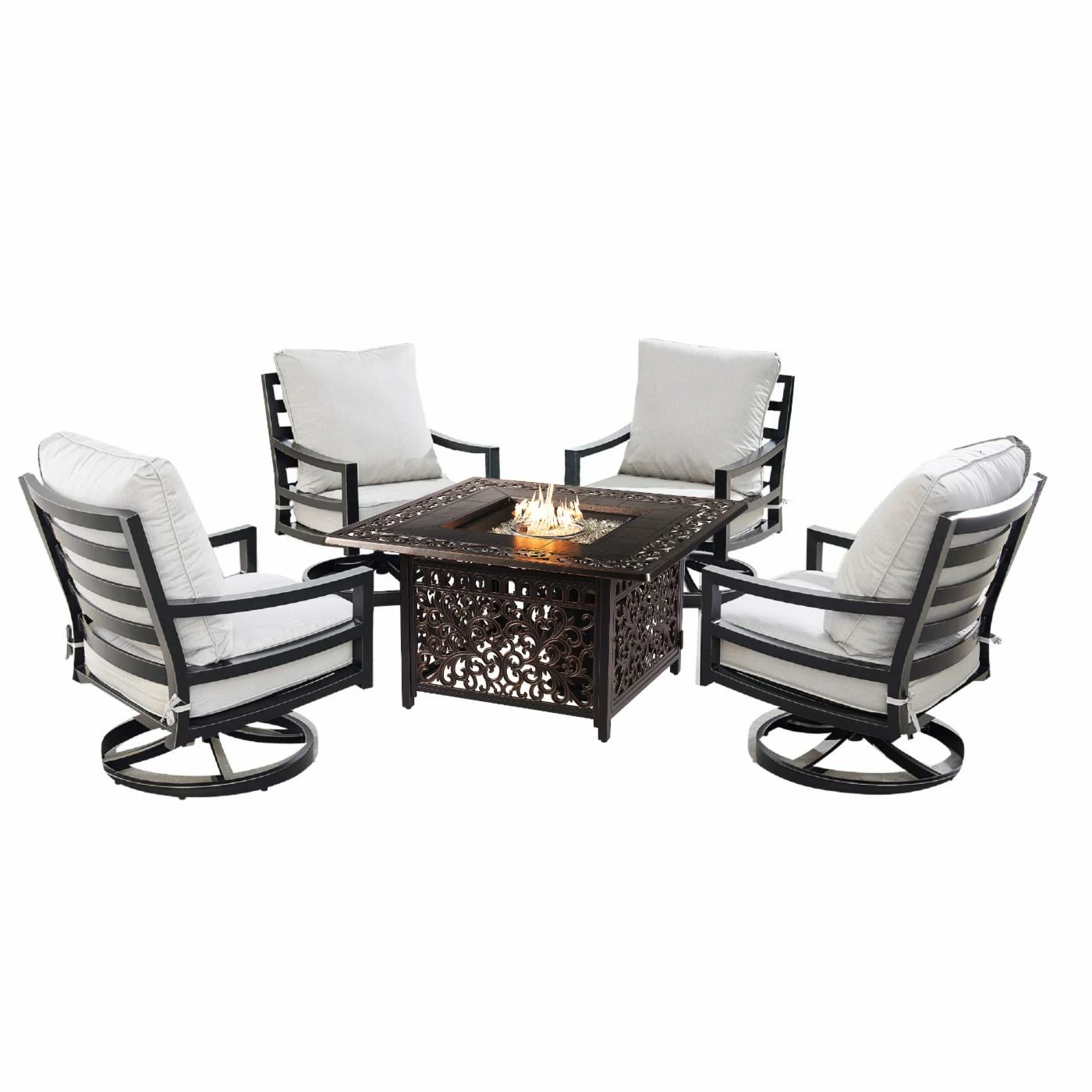 Whether your outdoor retreat is located in the mountains, on the coast, or somewhere in between, the Oakland Living Hudson Mayan Aluminum 5 Piece Propane Fire Pit Chat Set will extend your evenings with friends and family around the fire.ย With this addition you can enhance your outdoor setting with even more ambiance and relaxation. This fire table set comes with an Outdoor Aluminum 42 in. Square Fire Table Set, Four Deep Seating Swivel Rocking Chairs, Fire Beads, Lid and Fabric Cover.