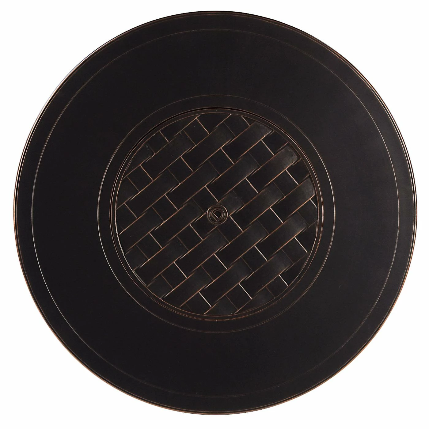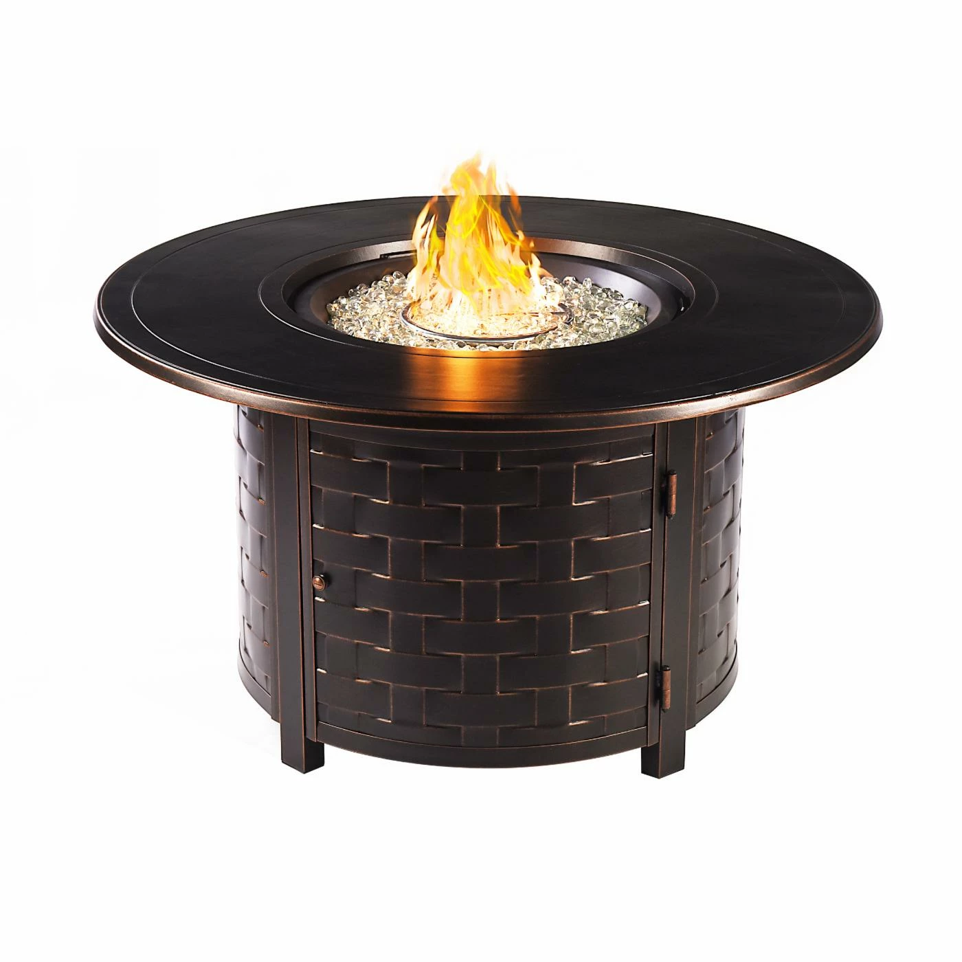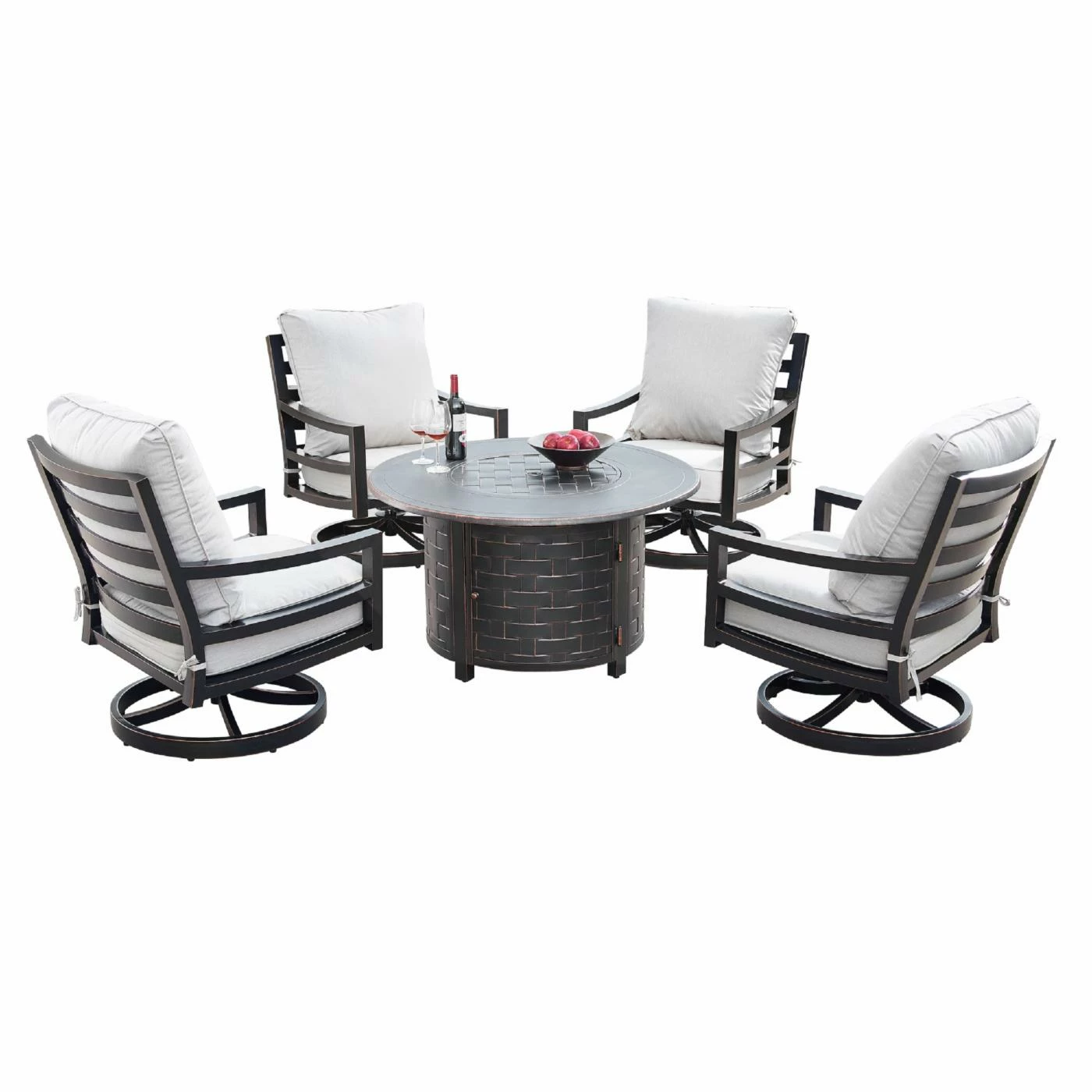 Whether your outdoor retreat is located in the mountains, on the coast, or somewhere in between, the Oakland Living Hudson Rico Aluminum 5 Piece Propane Fire Pit Chat Set will extend your evenings with friends and family around the fire. With this addition you can enhance your outdoor setting with even more ambiance and relaxation. This fire table set comes with an Outdoor Aluminum 44 in. Round Fire Table Set, Four Deep Seating Swivel Rocking Chairs, Fire Beads, Lid and Fabric Cover.