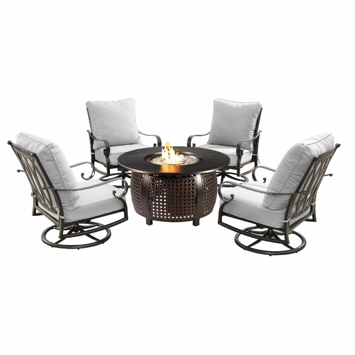 Whether your outdoor retreat is located in the mountains, on the coast, or somewhere in between, the Oakland Living Rica Cliff Aluminum 5 Piece Propane Fire Pit Chat Set will extend your evenings with friends and family around the fire. With this addition you can enhance your outdoor setting with even more ambiance and relaxation. This fire table set comes with an Outdoor Aluminum 44 in. Round Fire Table Set, Four Deep Seating Swivel Rocking Chairs, Fire Beads, Lid and Fabric Cover.