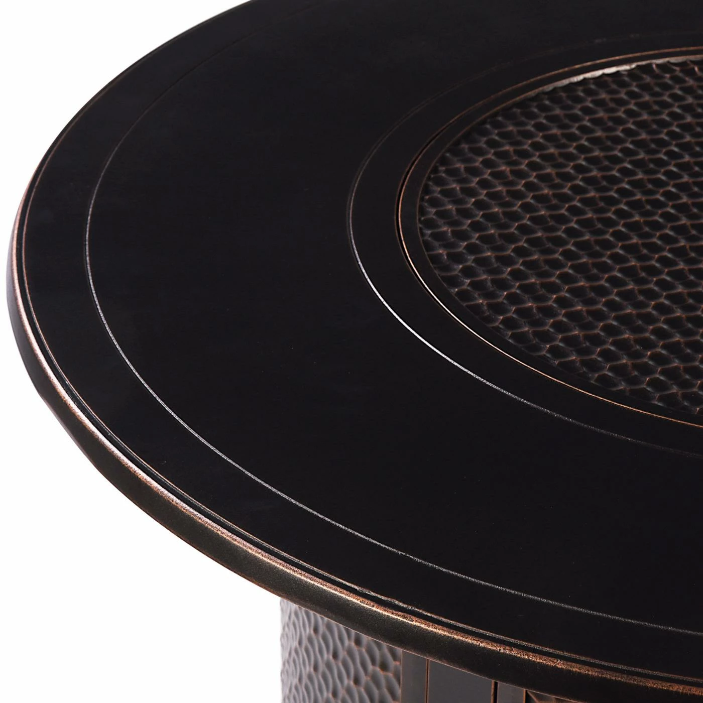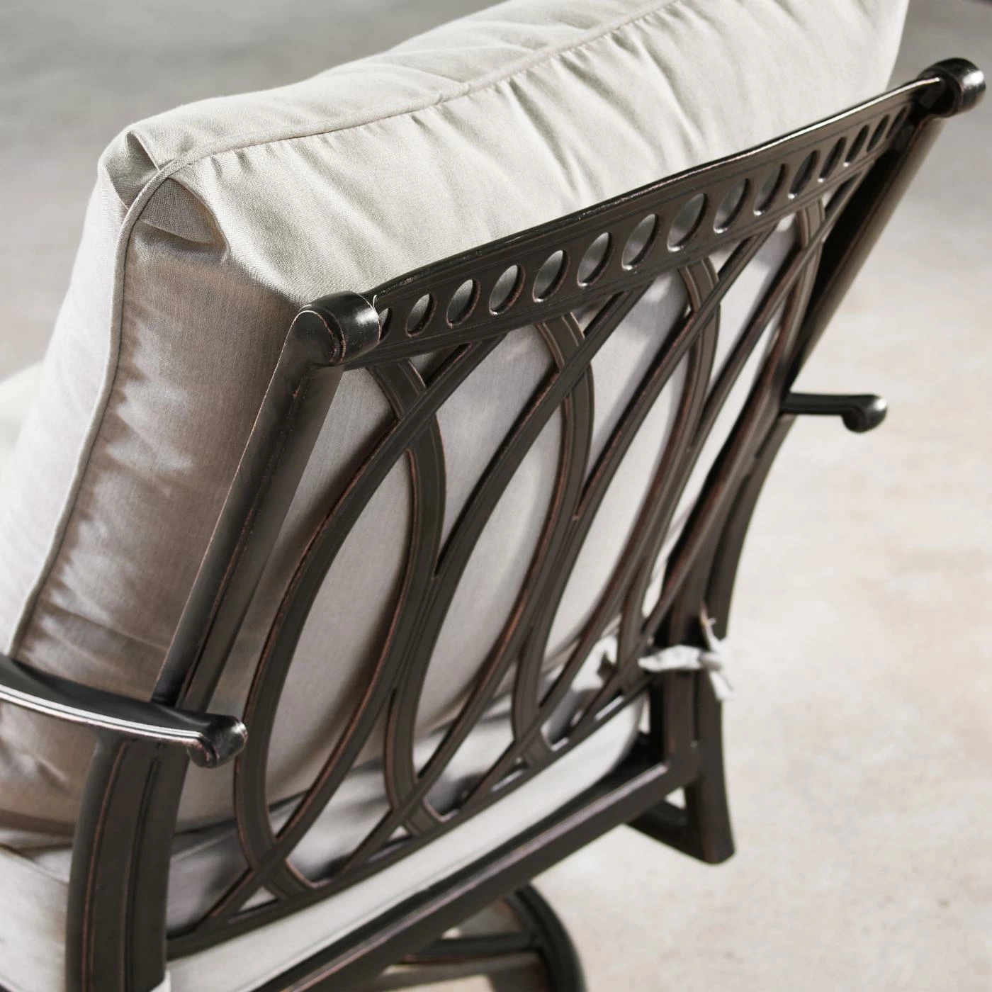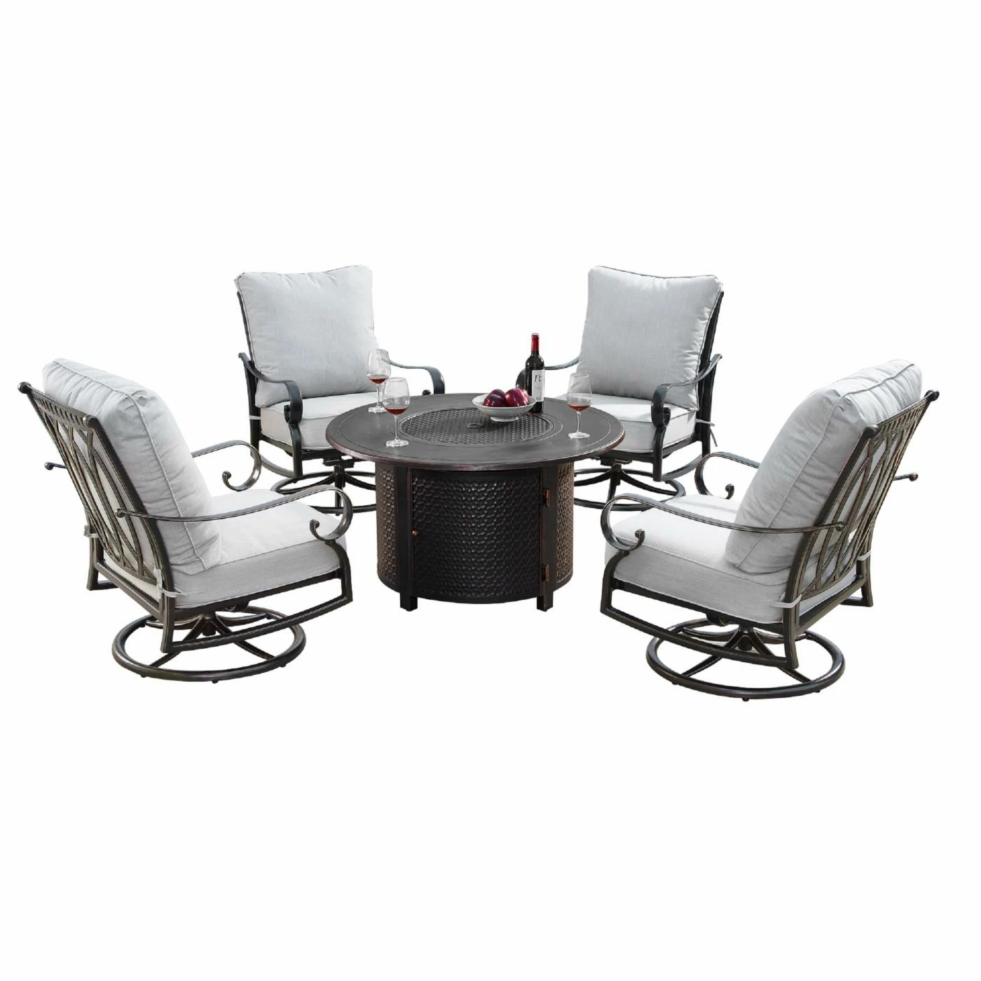 Whether your outdoor retreat is located in the mountains, on the coast, or somewhere in between, the Oakland Living Rica Matera Aluminum 5 Piece Propane Fire Pit Chat Set will extend your evenings with friends and family around the fire.ย With this addition you can enhance your outdoor setting with even more ambiance and relaxation. This fire table set comes with an Outdoor Aluminum 44 in. Round Fire Table Set, Four Deep Seating Swivel Rocking Chairs, Fire Beads, Lid and Fabric Cover.