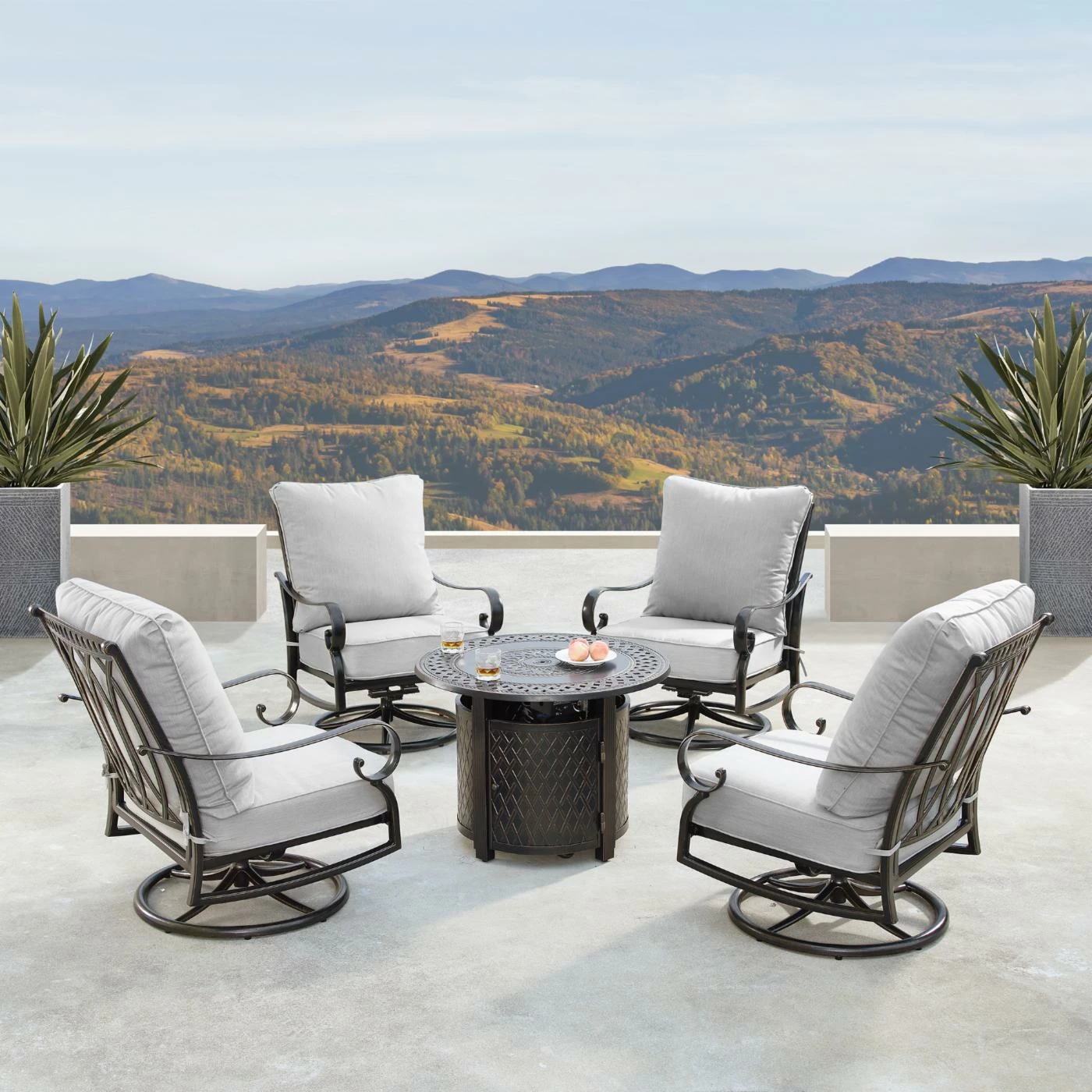Whether your outdoor retreat is located in the mountains, on the coast, or somewhere in between, the Oakland Living Rica Ritz Aluminum 5 Piece Propane Fire Pit Chat Set will extend your evenings with friends and family around the fire.ย With this addition you can enhance your outdoor setting with even more ambiance and relaxation. This fire table set comes with an Outdoor Aluminum 34 in. Round Fire Table Set, Four Deep Seating Swivel Rocking Chairs, Fire Beads, Lid and Fabric Cover.