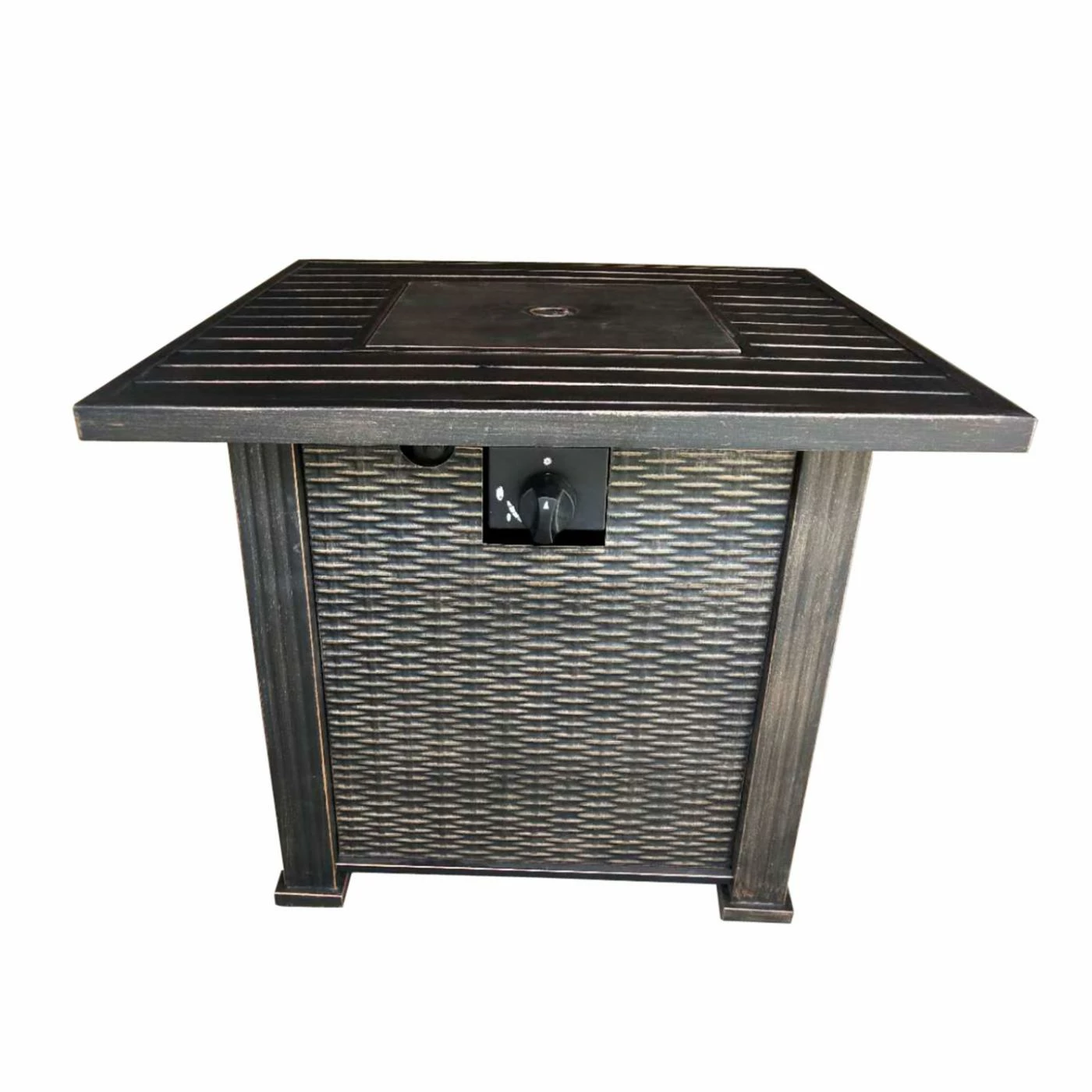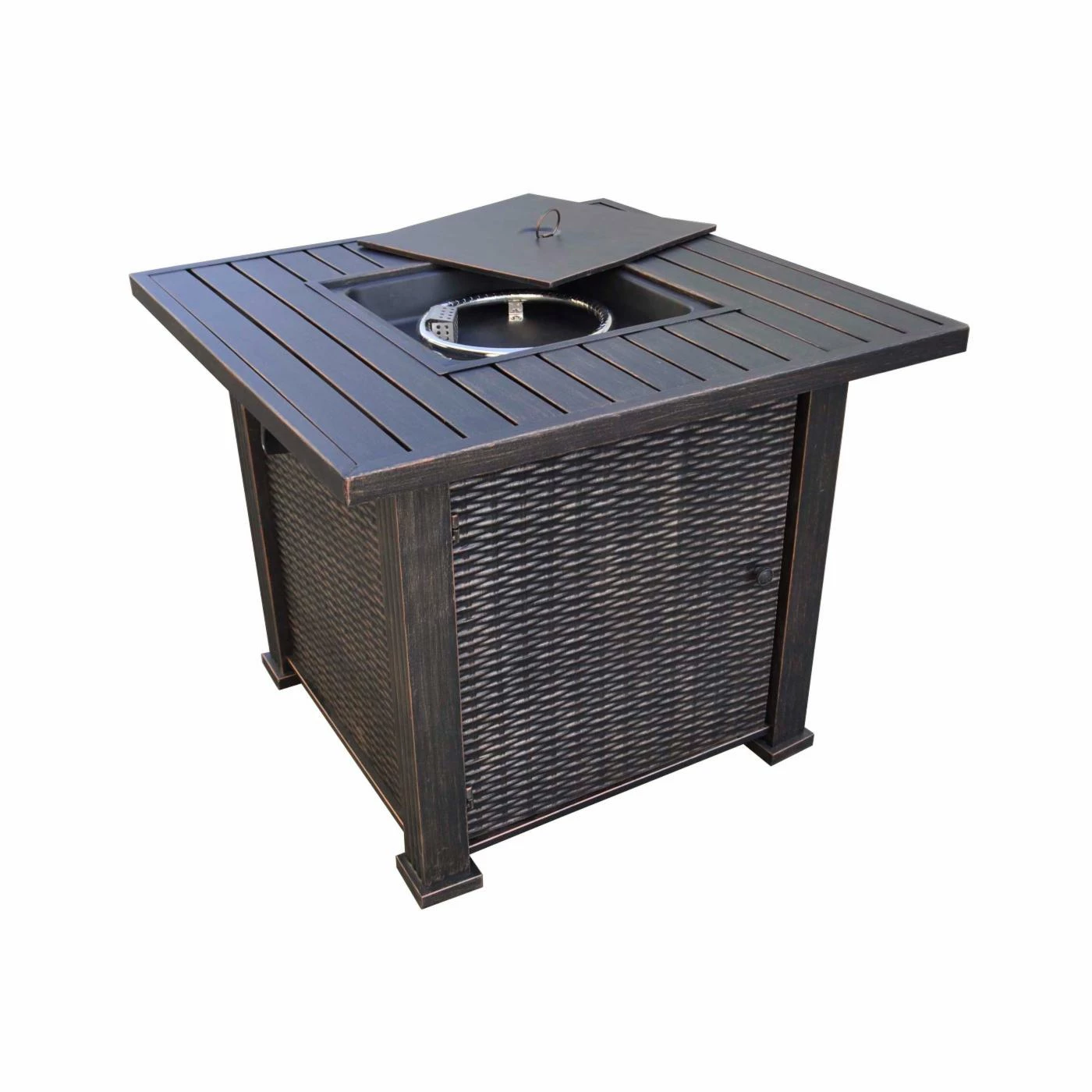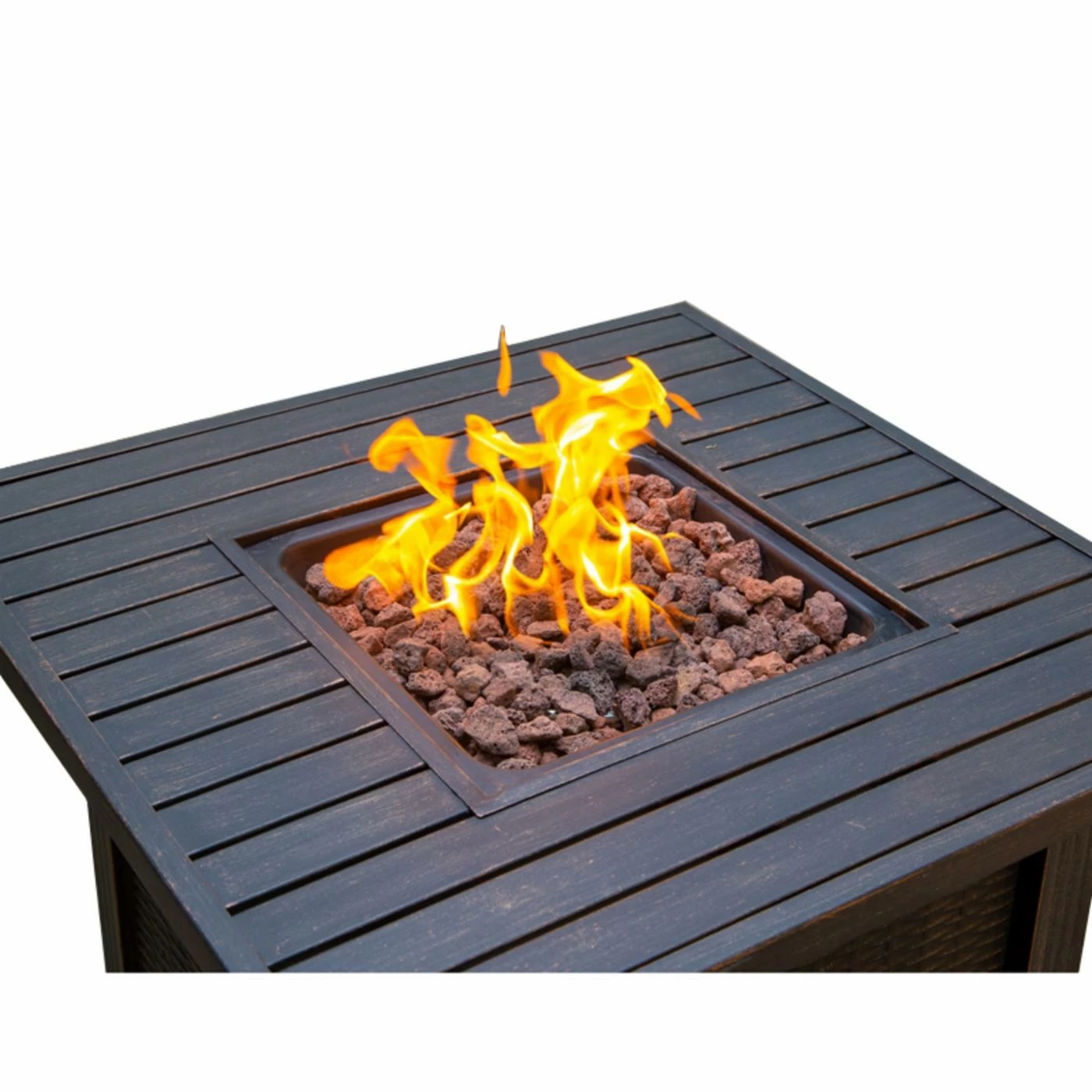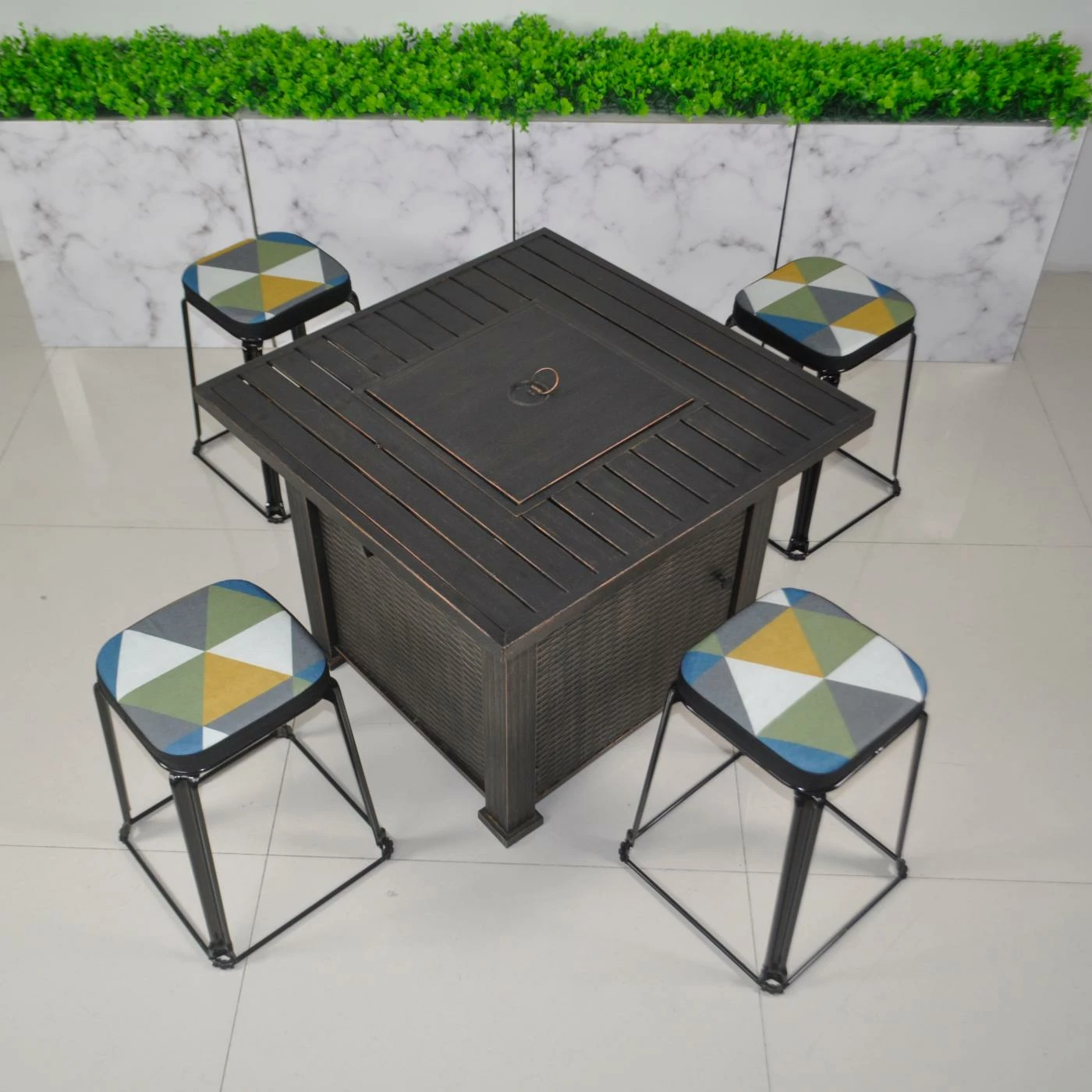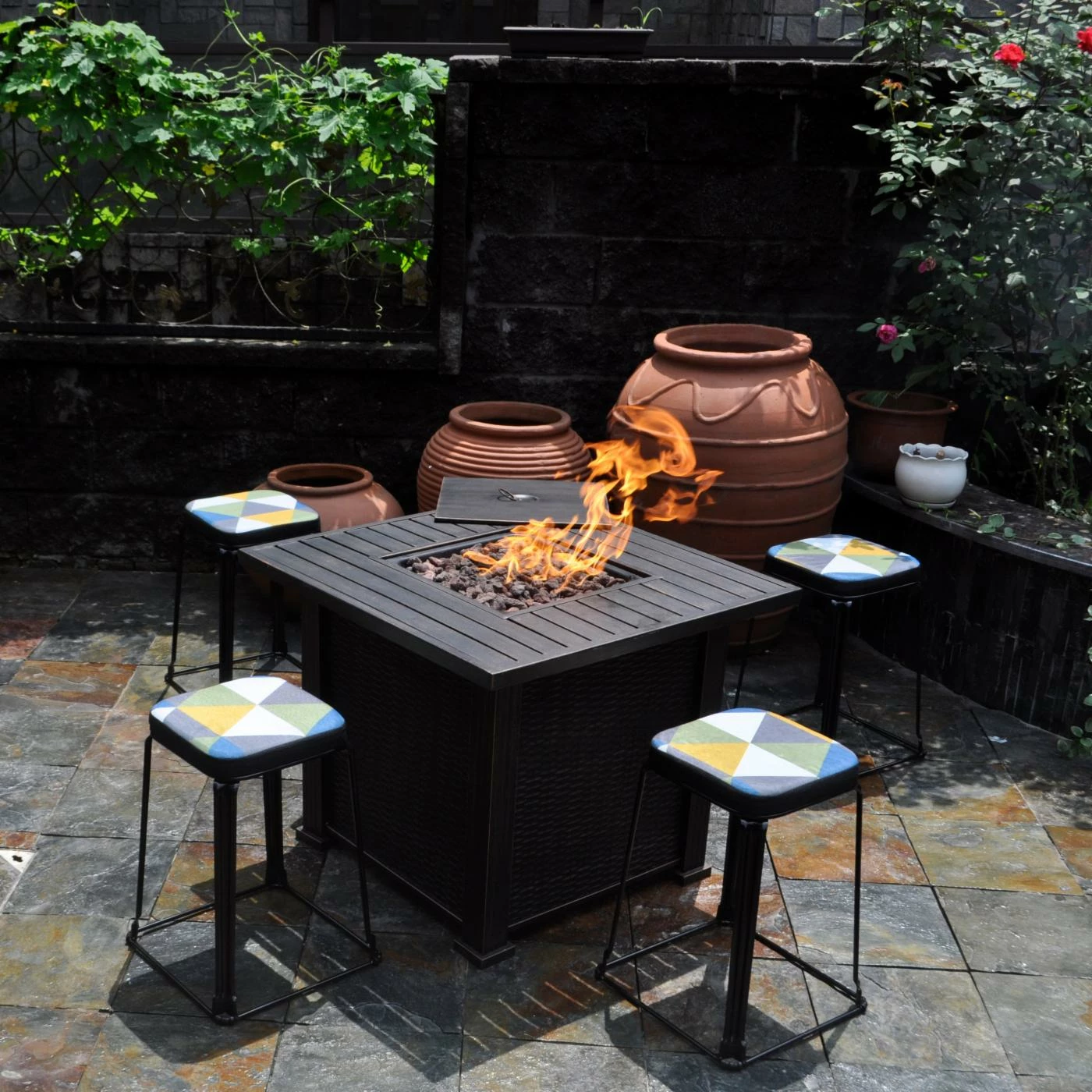 The Paradise Cove Designs Cocoa 5 Piece Fire Pit Set with Fabric Seats will extend your summer into fall and beyond winter with this modern design steel fire pit table. Your guests will naturally gather around the alluring fire pit table and enjoy the warm ambiance that it creates. Constructed of a steel frame, the fire pit conveniently hides the propane inside the base. Operates at a maximum of 30,000 BTUs, offering warmth and a beautiful view. Natural lava rocks handsomely accent the flames, enhancing your surroundings. The liquid propane provides a clean, smokeless burn with plenty of heat, so you can sit by the fire and enjoy the warm outdoors without worrying about smoke or ashes. The table insert transforms the pit into a table when not in use for extra space for refreshments while you and your guest are still enjoying the outdoors. This stool cheers to good times, great versatility and classic style. Heavy-duty metal stools that are also lightweight. Crafted of iron and steel in a semi-gloss finish, this barstool features a vented square seat and four tapered bracket legs. This metal bar stool is also wonderfully stackable, which makes for quick seating solutions around the house if you need more chairs for your guests during a party.