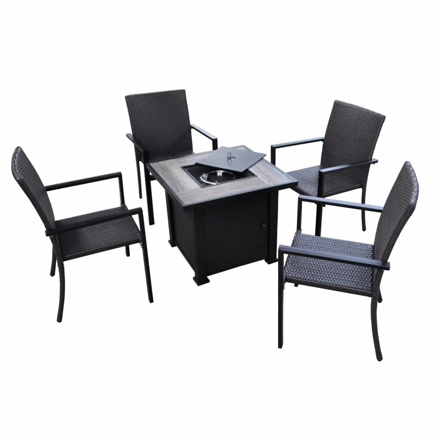 - Set includes fire pit table and 4 arm chairs