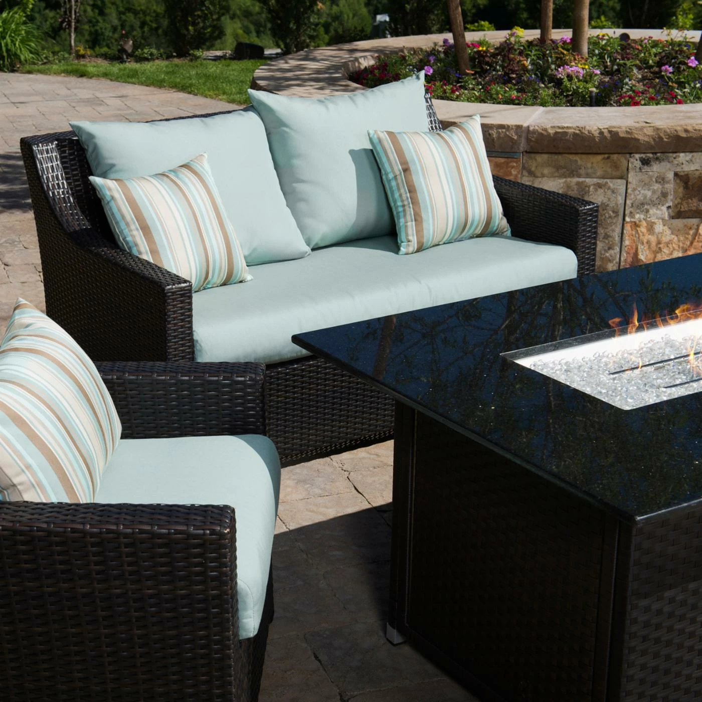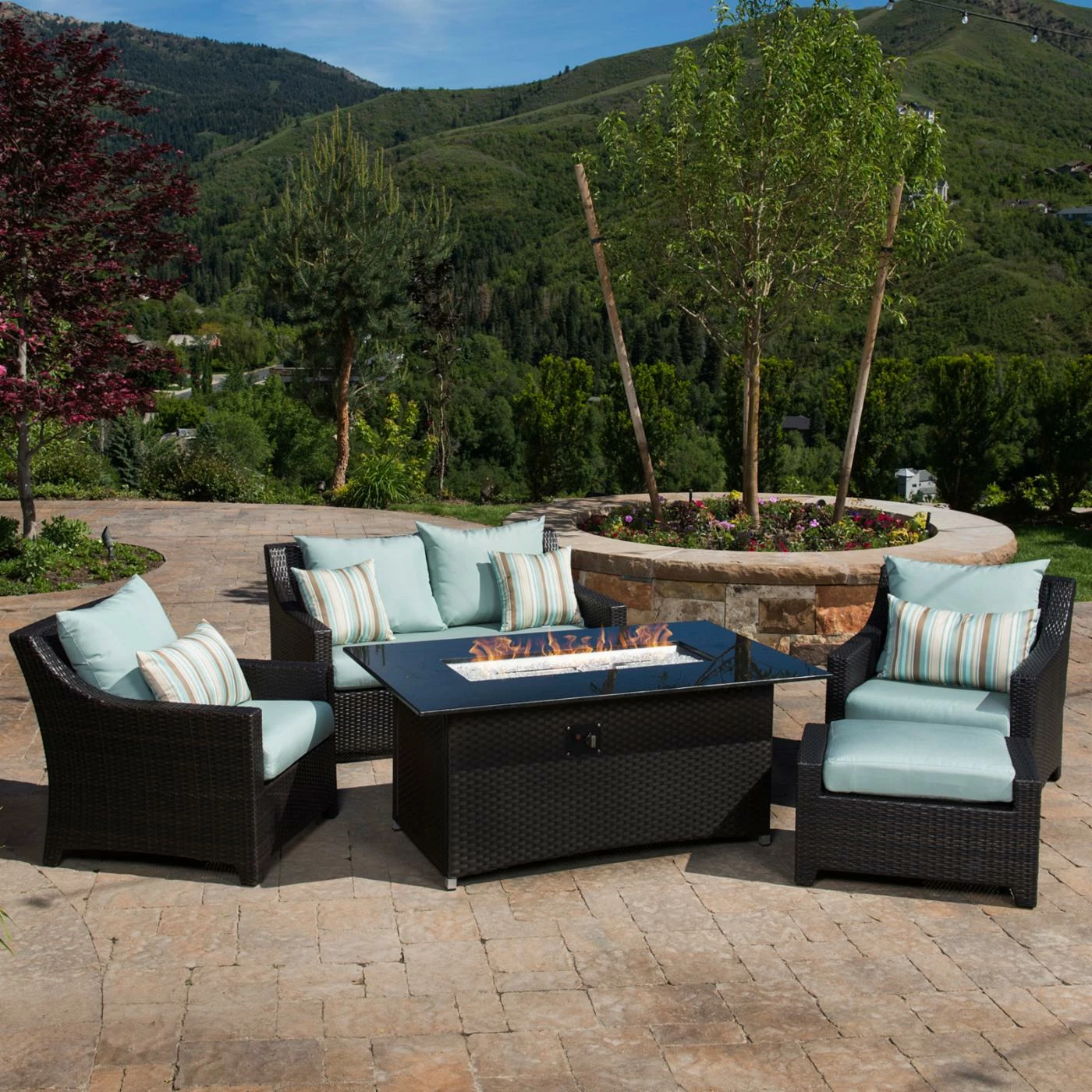 Experience a backyard campfire gathering with a contemporary, comfortable touch of the RST Brands Deco 5 Piece Love and Club Fire Chat Set. This sleekly designed set includes two club chairs, one love seat, and one ottoman that can be placed around a rectangular table with a flame tray in the center. The tray is lit by a propane tank from in the bottom (not included) and creates warmth up to 55,000 BTU. A side door in the table lets you effortlessly access the propane tank and hides it away from sight. The durable granite honeycomb surface is perfect for outdoor use; it is non-absorbent, weather resistant, and lighter than average granite tops. In the burner tray are beautiful tempered glass media which create an inviting glow. Choose from available finishes and cushion fabrics to match your patio.