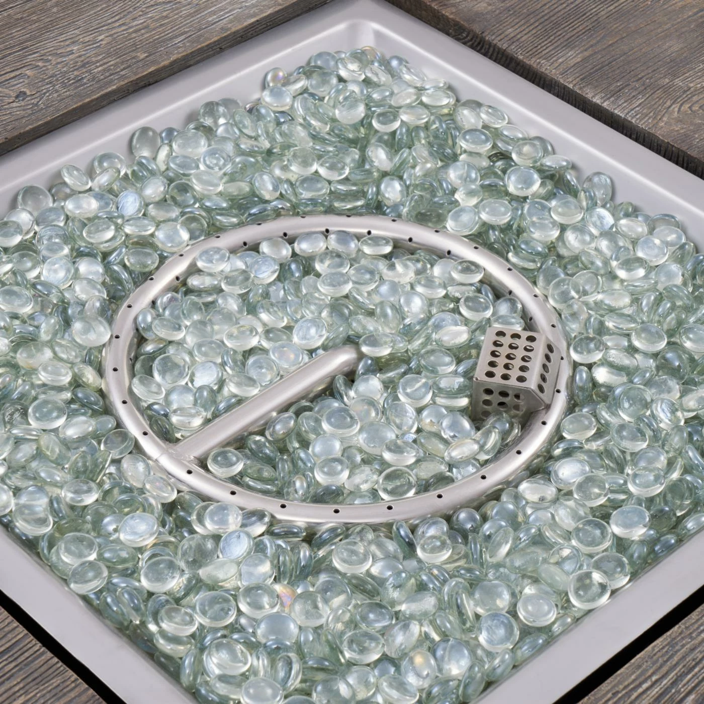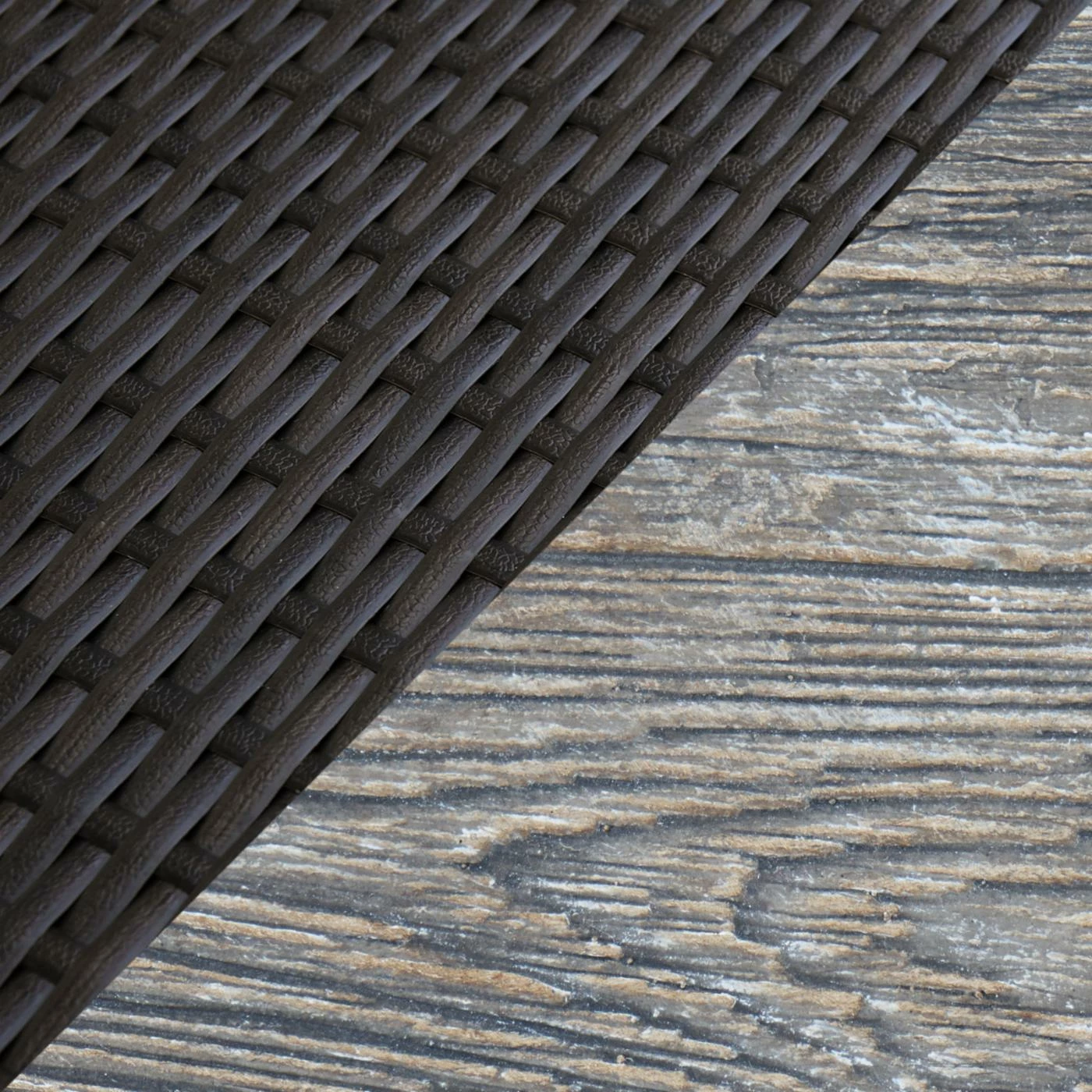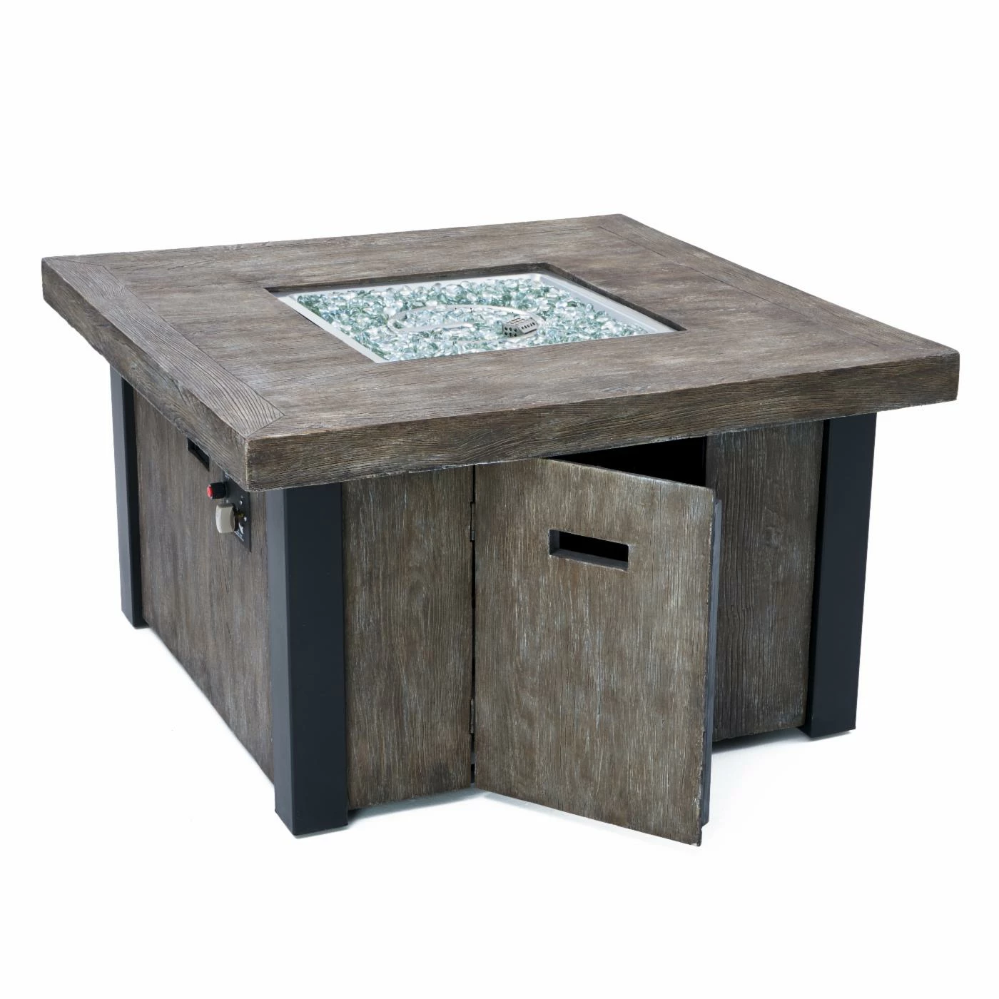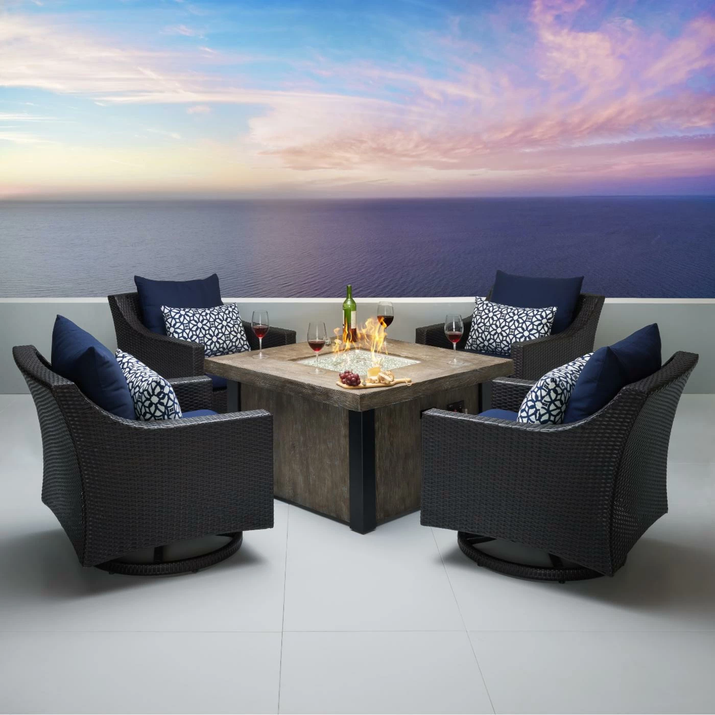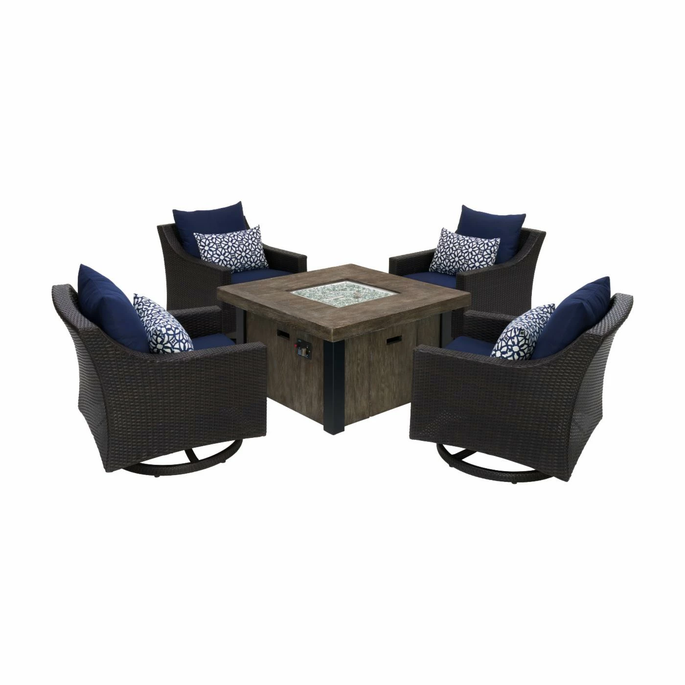 The RST Brands Deco 5 Piece Motion Fire Pit Patio Conversation Set is sure to become the heart of your outdoor entertaining. You and three guests can gather comfortably in the motion club chairs that boast a 360-degree swivel and gentle rocking motion. Each chair boasts multi-layer foam cushions covered in weather- and fade-resistant Sunsharp fabric in an inviting navy hue. Coordinating lumbar accent pillows in a white and navy pattern offer extra support and visual interest. At the center of this set is the sleek square fire pit table. The fire pit has an easy push-button ignition, dial control, and can put out up to 55,000 BTU. An easy access door in the base makes it a breeze to change out the propane tank (not included). This conversation set is constructed with durable, powder-coated aluminum frames and covered in hand-woven espresso resin wicker that is easy to clean and resists fading.