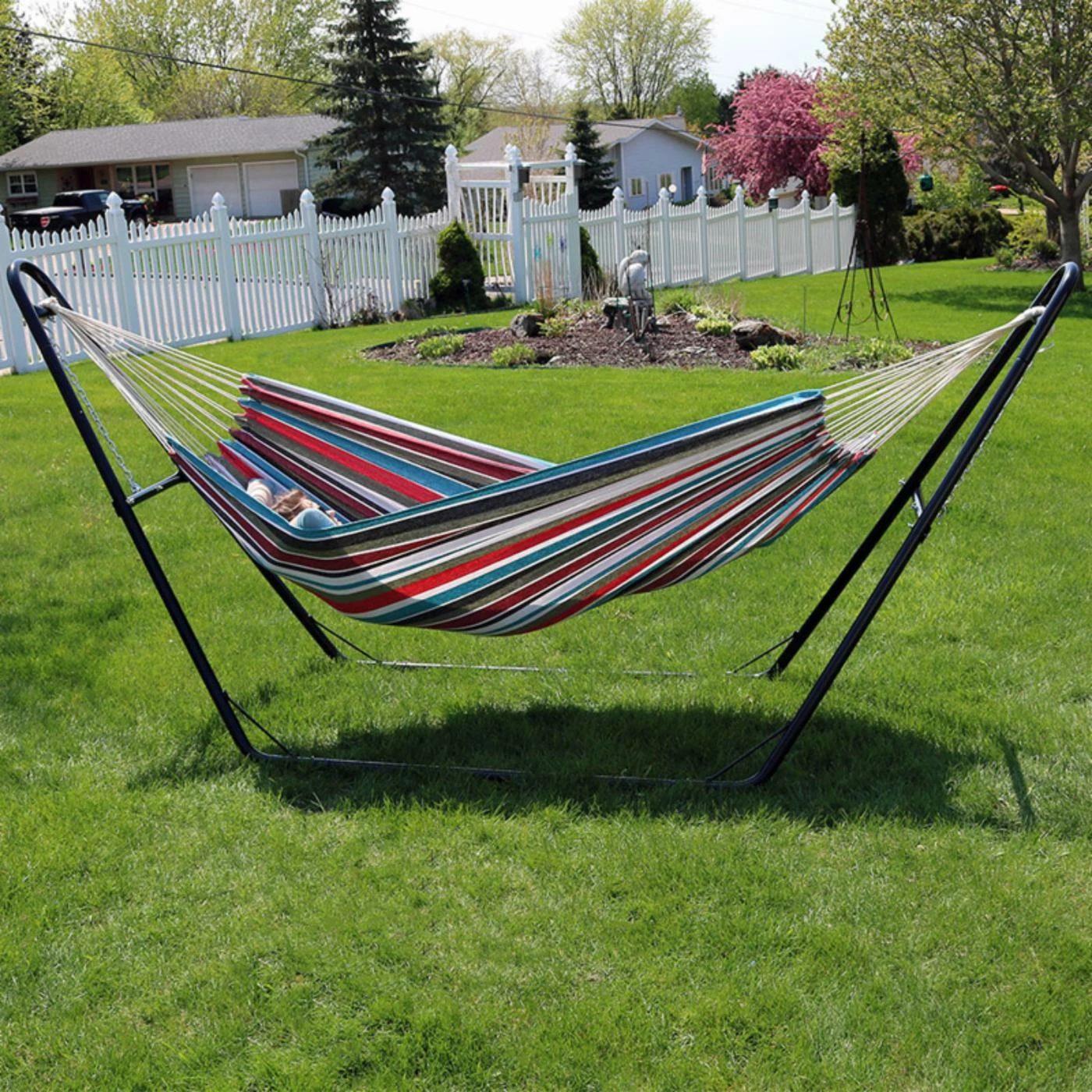 Lounging in the Sunnydaze Decor Brazilian Hammock with Universal Steel Stand outdoors will make you feel calm and relaxed. This cozy hammock boasts soft yet durable cotton construction. The steel stand can be set up almost anywhere outdoors. It’s designed to hold up to two people and can support 440 pounds. This hammock is offered in your choice of available color.