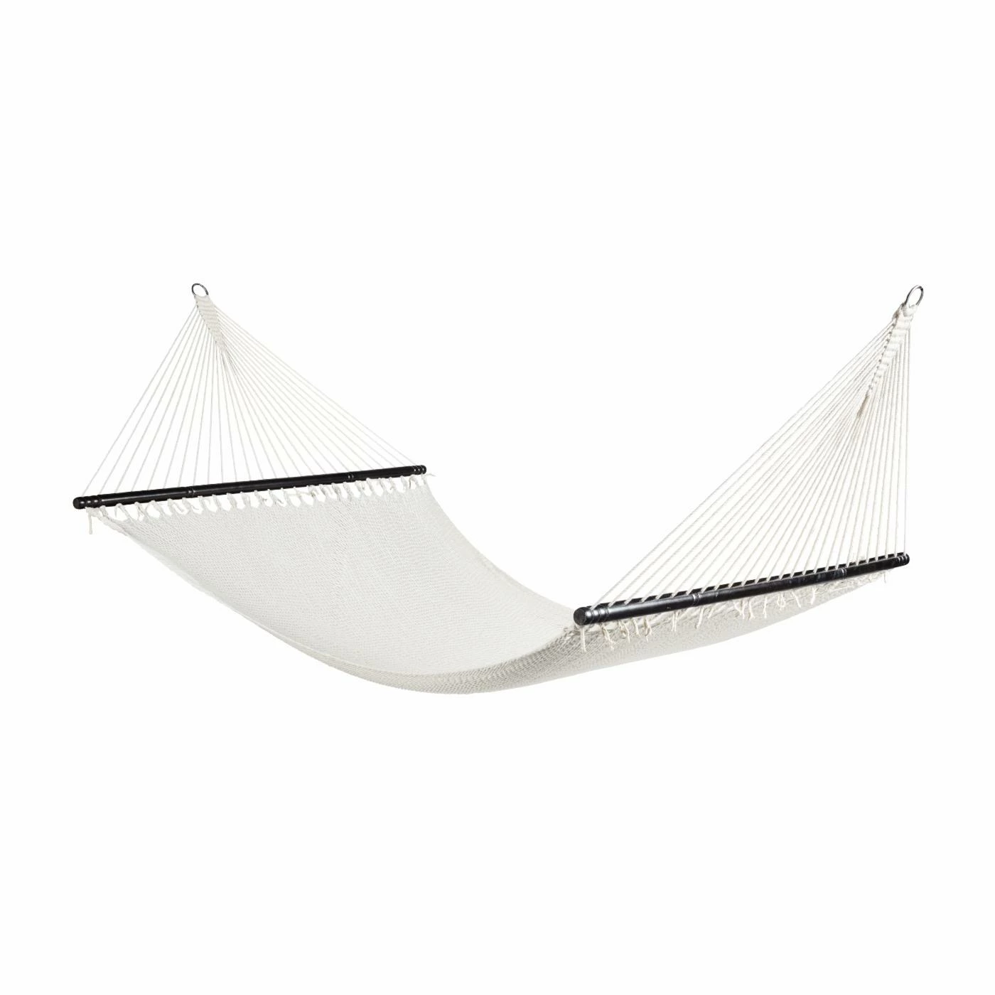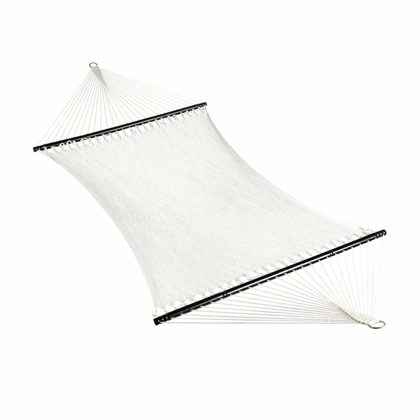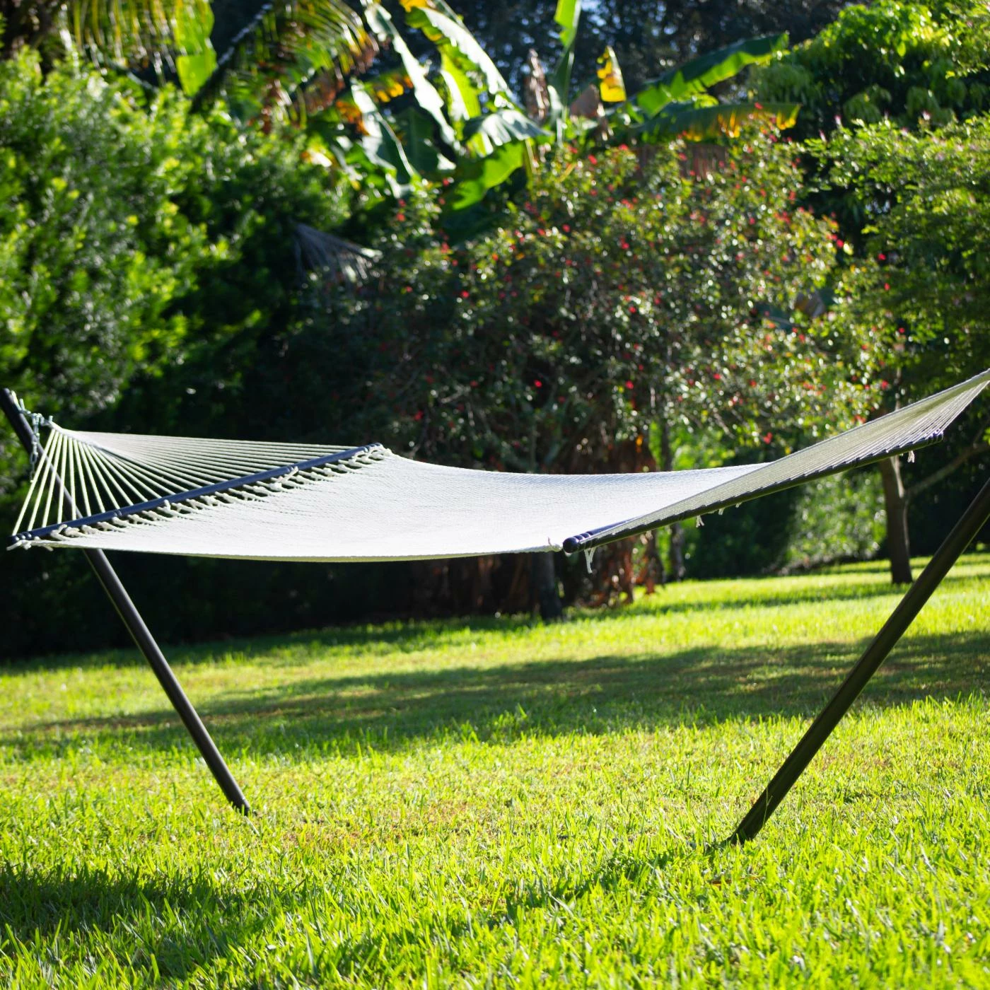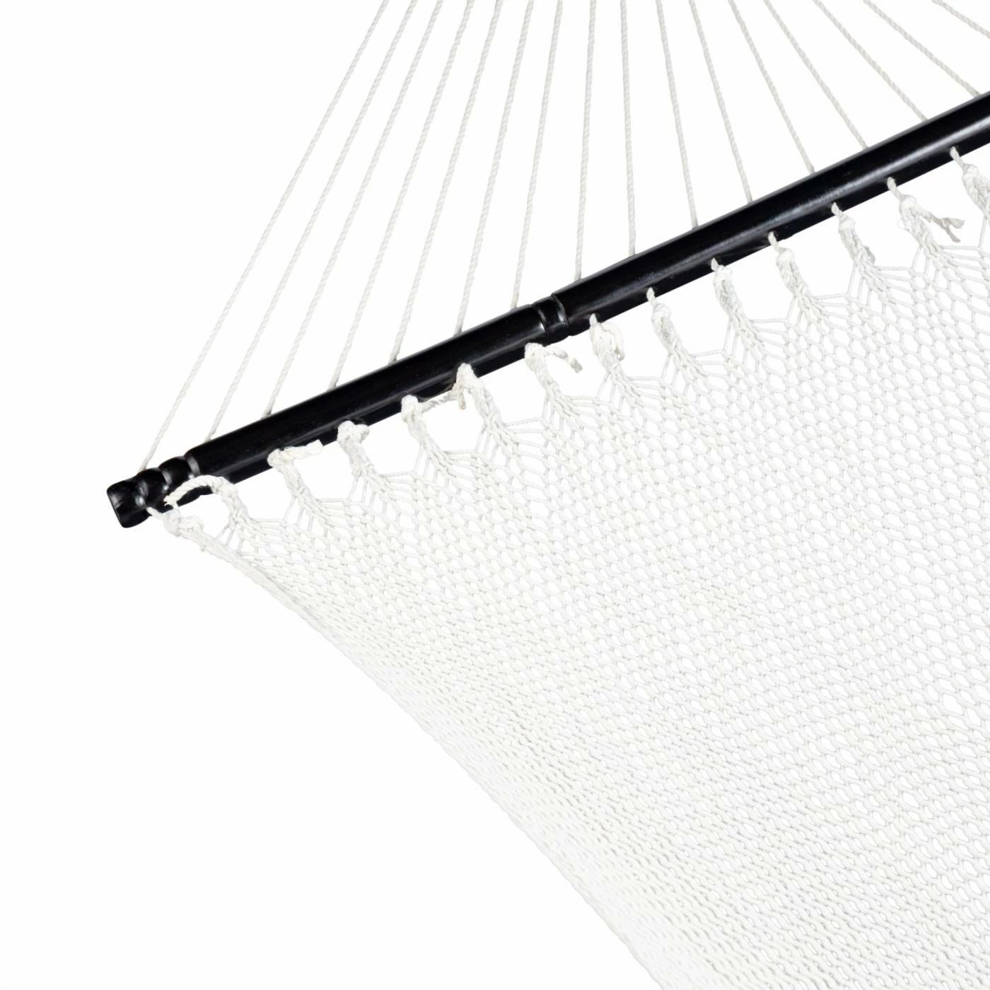 The Bliss Hammocks 2-Person Weekender Deluxe Rope Hammock is handcrafted with 3-PLY 4mm polyester rope that will last for years and contours your body, while keeping you cool! It features carved hardwood spreader bars with mahogany varnished smooth finish and stainless steel βOβ rings. Itβs easy to hang with included βSβ hooks & chains and fits a standard 15 ft. hammock stand.Β