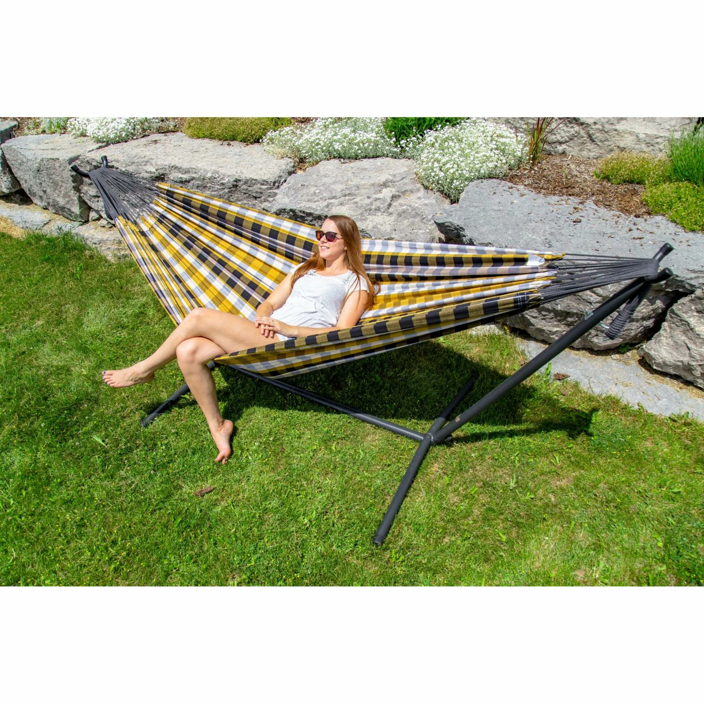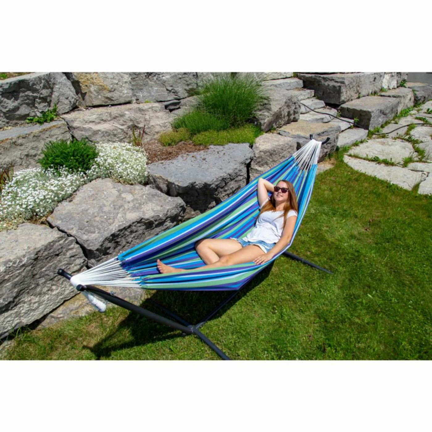 Enjoy a lazy afternoon by the pool or in the shade with the Vivere 9 ft. Double Cotton Hammock with Stand, boasting cotton construction and your choice of available color. This large, supportive hammock seats two comfortably so you can sit back and relax under the sun or stars. It includes a durable stand made of heavy duty, powder coated steel for ease of use and placement anywhere you please.