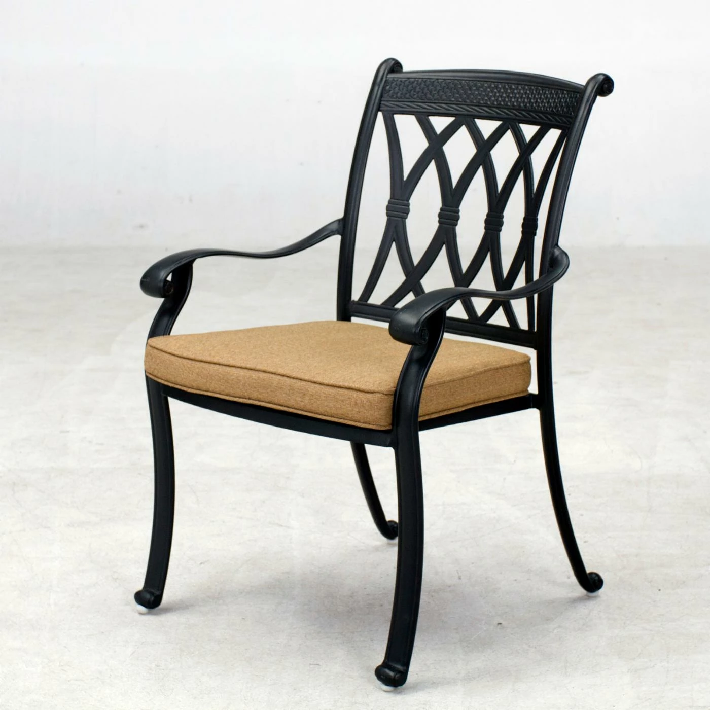 - Lattice chair seats and backs with curved arms