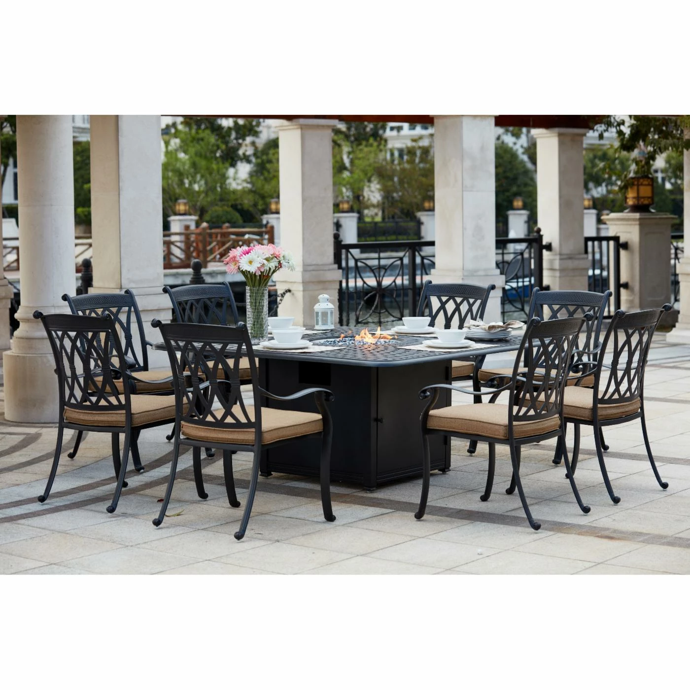 Big family gatherings are always warm – and the Darlee Capri 9 Piece Aluminum Square Fire Pit Patio Dining Set keeps them that way. This cozy, generously appointed outdoor dining set – including eight armchairs and a square fire pit dining table – is hand-crafted with durable, weather-resistant cast aluminum powder-coated in a multi-step antique bronze finish. The stackable chairs boast curved arm rests and lattice-design seats and backs; thick sesame-hued polyester cushions tie on securely. At the center of the woven-top table is a 41,000-BTU stainless steel burner with adjustable heat settings; simply add your own propane tank (it’s not included), fill the bowl with the included ocean blue fire glass, and set the flame. Assembly is required. Manufacturer’s warranties include: one year for the cushions, five years for the frames, one year for the fire pit burner.