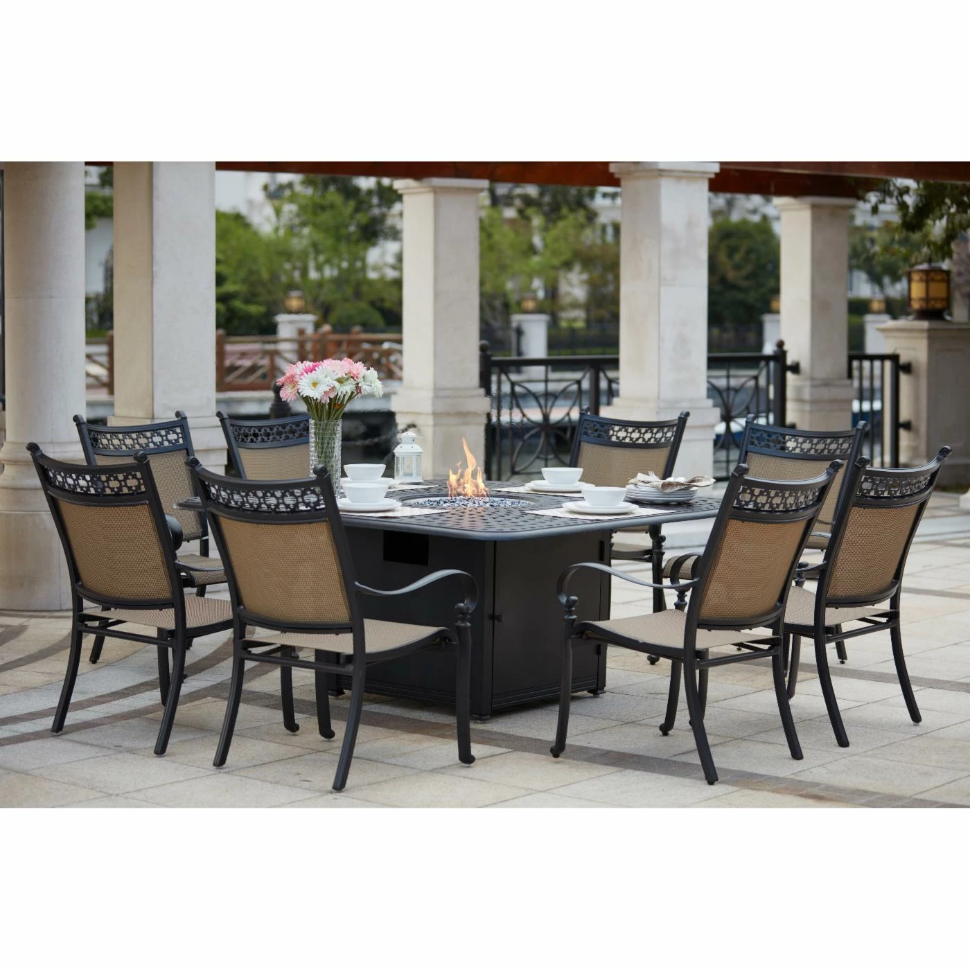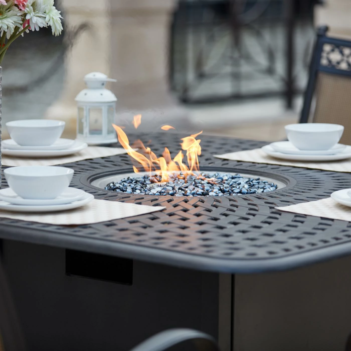 Outdoor dining becomes more elegant with the addition of the Darlee Mountain View 9 Piece Aluminum Square Fire Pit Patio Dining Set on your porch, patio, or deck. This durable dining set offers comfortable seating for eight, combining eight cast aluminum dining chairs with a coordinating table that delivers ample tabletop space. The center of the table features a 41,000-BTU stainless steel burner and ocean blue fire glass, putting a warm fire within arm’s reach. As a result, this versatile table transforms into a cozy spot to relax long after dining ends.