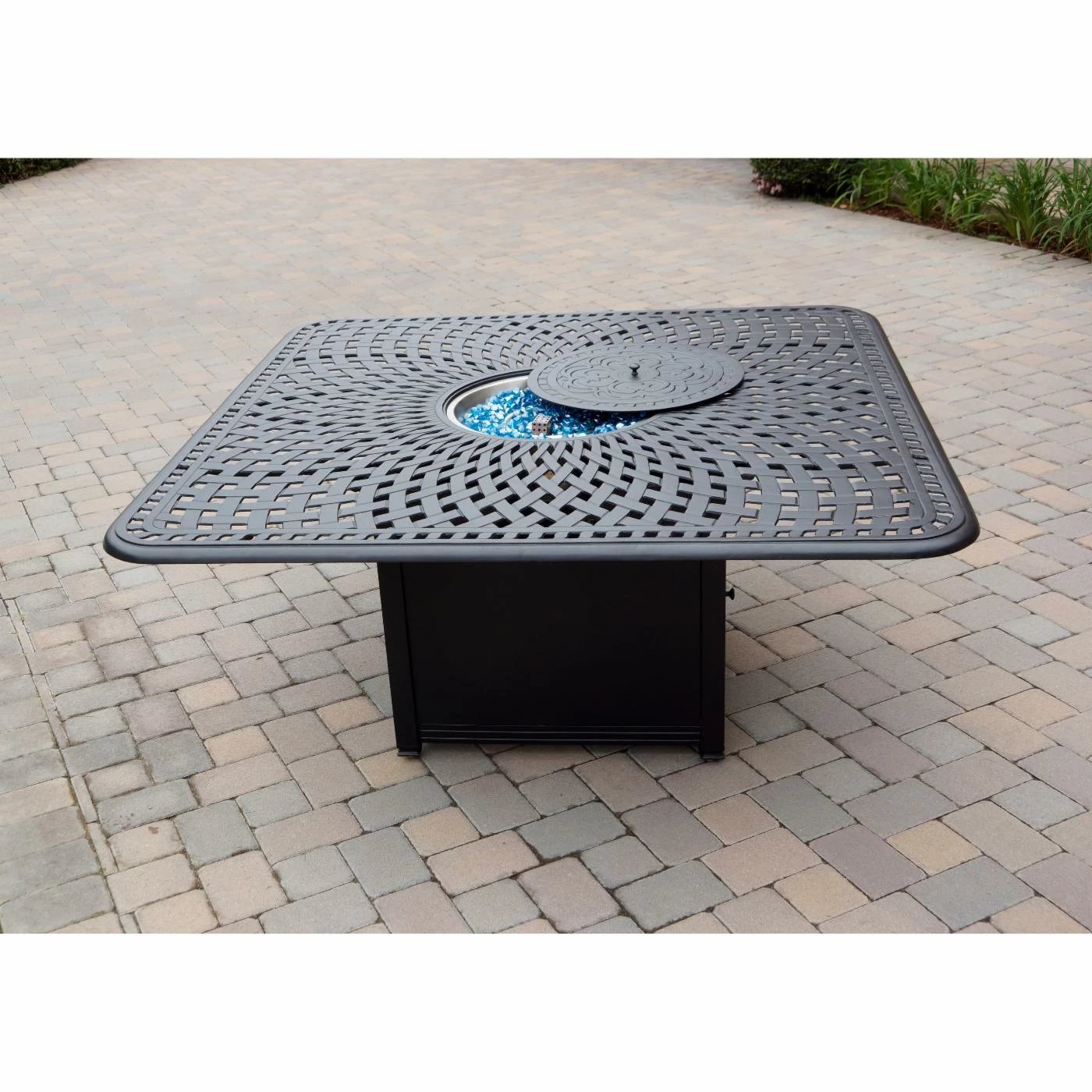 - Propane fire pit with blue fire glass