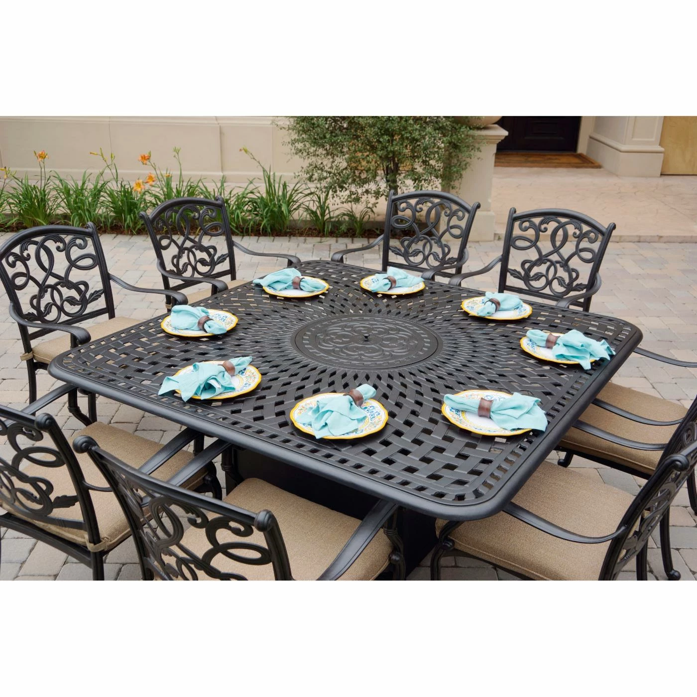 What’s not to love when thinking of the beautiful yet durable Darlee Santa Monica Aluminum 9 Piece Propane Fire Pit Patio Dining Set with Cushions and Fire Glass? Our 9 piece set combines the convenience of a large dining table with a welcoming fire. The set comes with firepit table, burner, fire glass, and eight dining chairs with seat cushions. All the frames are cast aluminum with a rich antique bronze finish. The chairs are fully welded and stackable for easy storage.