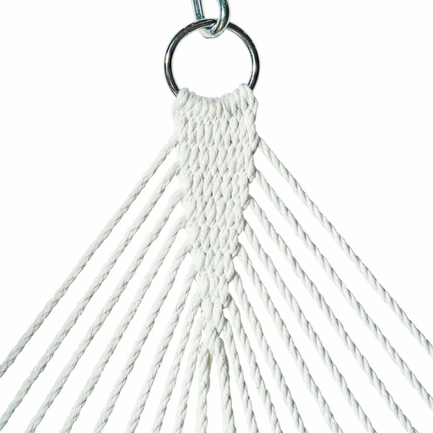 The Bliss Hammocks Oversized Hammock is made of 100% Cotton Rope. It features Varnished Hardwood Spreader Bars and stainless steel O Rings. IT’s easy to hang with included “S” hooks & chains and fits a standard 15 ft. hammock stand. The dimensions are 80L X 55W in. (bed size) with an overall length of 12 ft.. Weight capacity 265 lbs