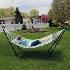 Brand new โค๏ธ Sunnydaze Decor Quilted 13 Ft. Double Fabric Hammock With Curved Arc Stand ๐งจ