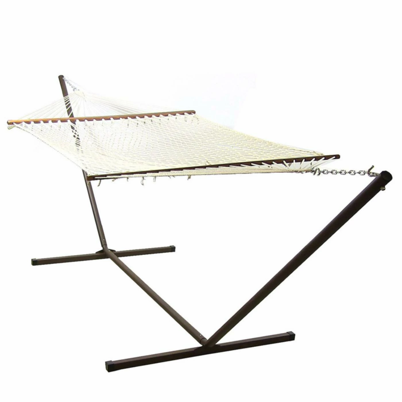 Take a staycation every weekend with the Sunnydaze Decor 11 ft. Sunnydaze Cotton Double Wide Rope Hammock with Wooden Spreader Bar and Metal Stand. This hammock is all about relaxing, so grab a book and fruity drink, and settle into the soft yet durable cotton rope material. Hardwood spreader bars make for easy entry and exit when itβs time to boogie. The steel stand features rubber caps on all end points to prevent injury. Includes hanging hardware.