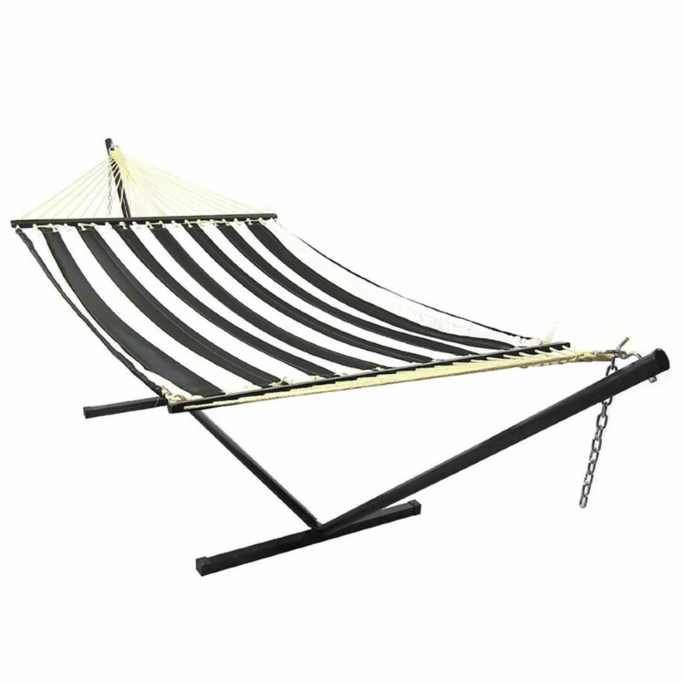 With black and white stripes and a black stand, the Sunnydaze Decor 12 ft. Sunnydaze Quilted Double Hammock with Metal Stand and Spreader Bar is a chic and modern gem that will improve any yard. The bed is made from quilted polyester for ultimate comfort. It has been treated to be UV-resistant. Hardwood spreader bars keep the bed open for easy entry and exit. A coordinating steel stand features rubber caps on each end point to prevent injury.