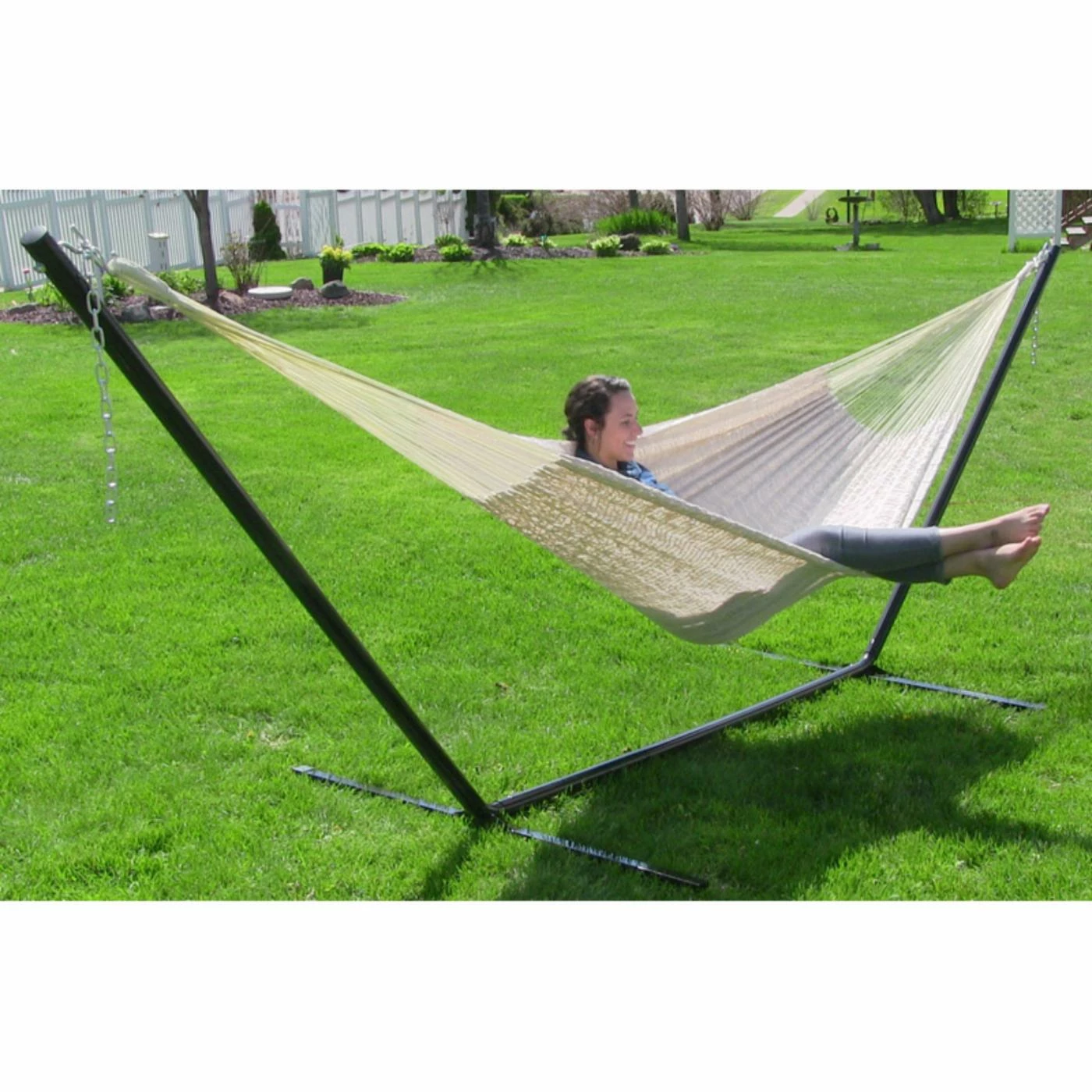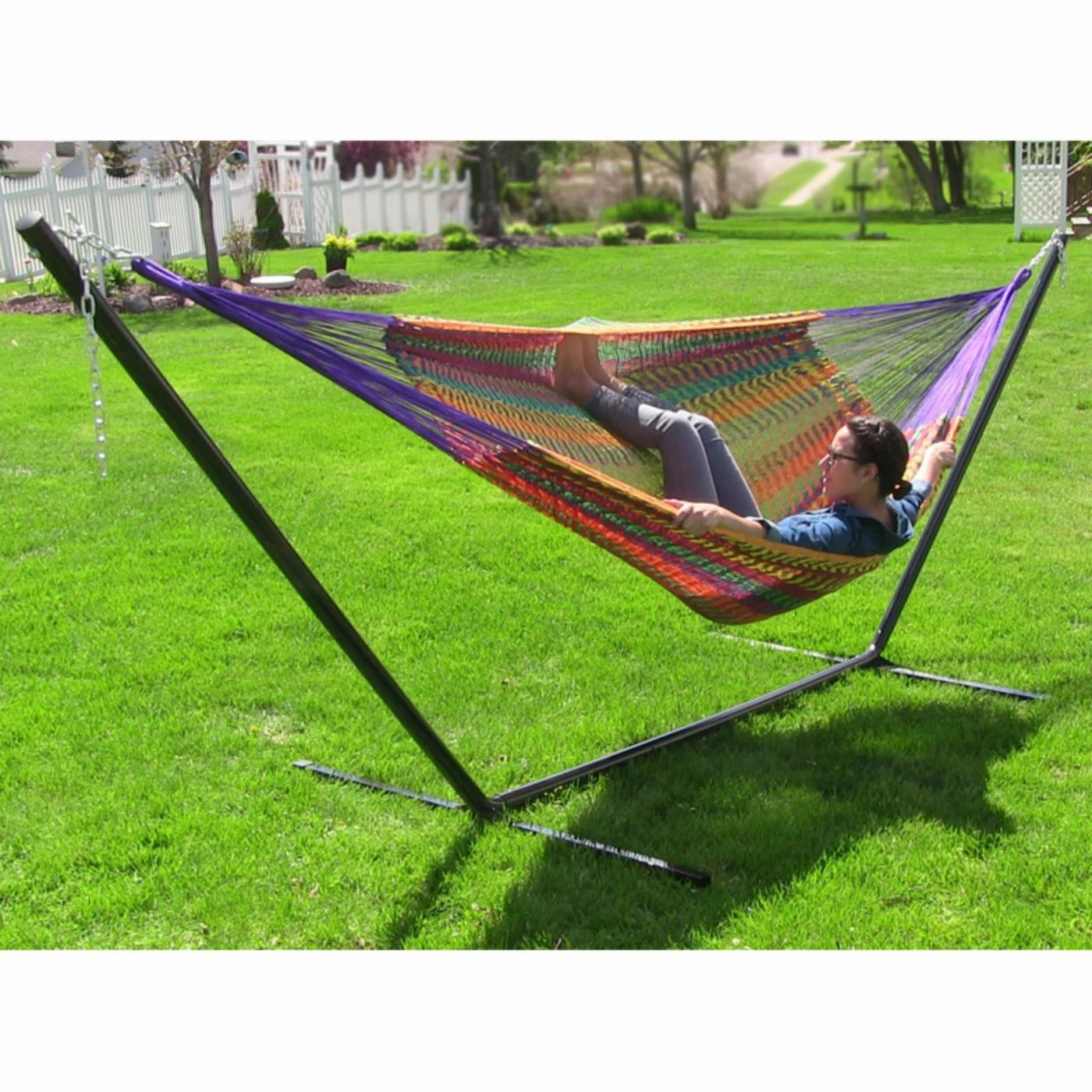 The Sunnydaze Decor Hand Woven XXL Mayan Family Hammock with Stand will be your new favorite spot to rest and relax. The cotton and nylon construction of this hammock ensures lasting durable and comfort. With the steel stand, this hammock can support up to 400 pounds. It’s offered in your choice of available color.