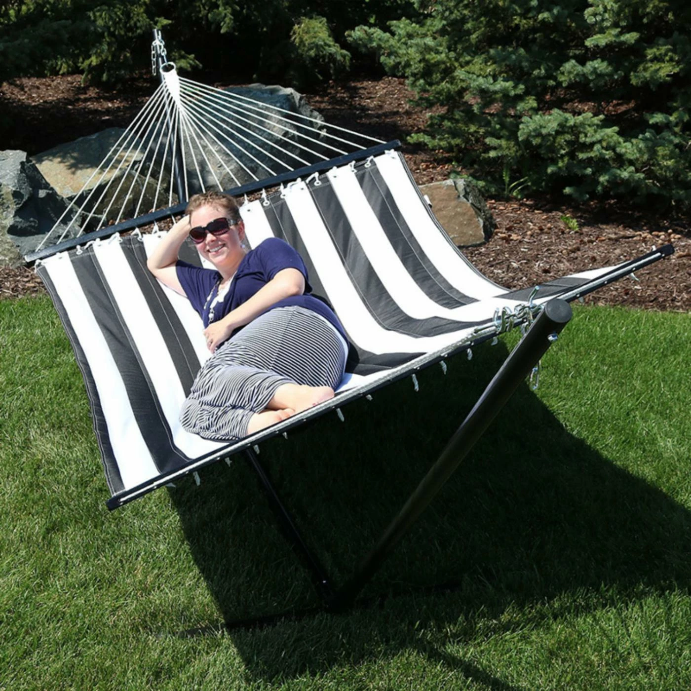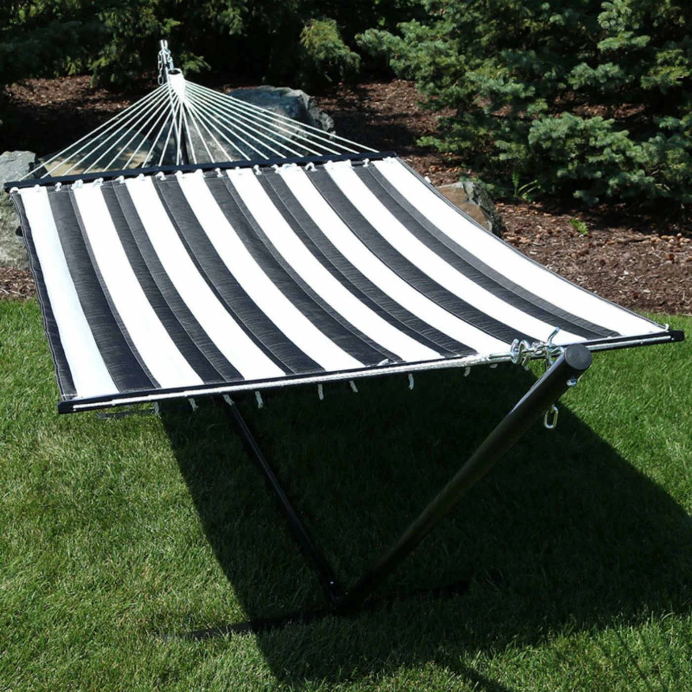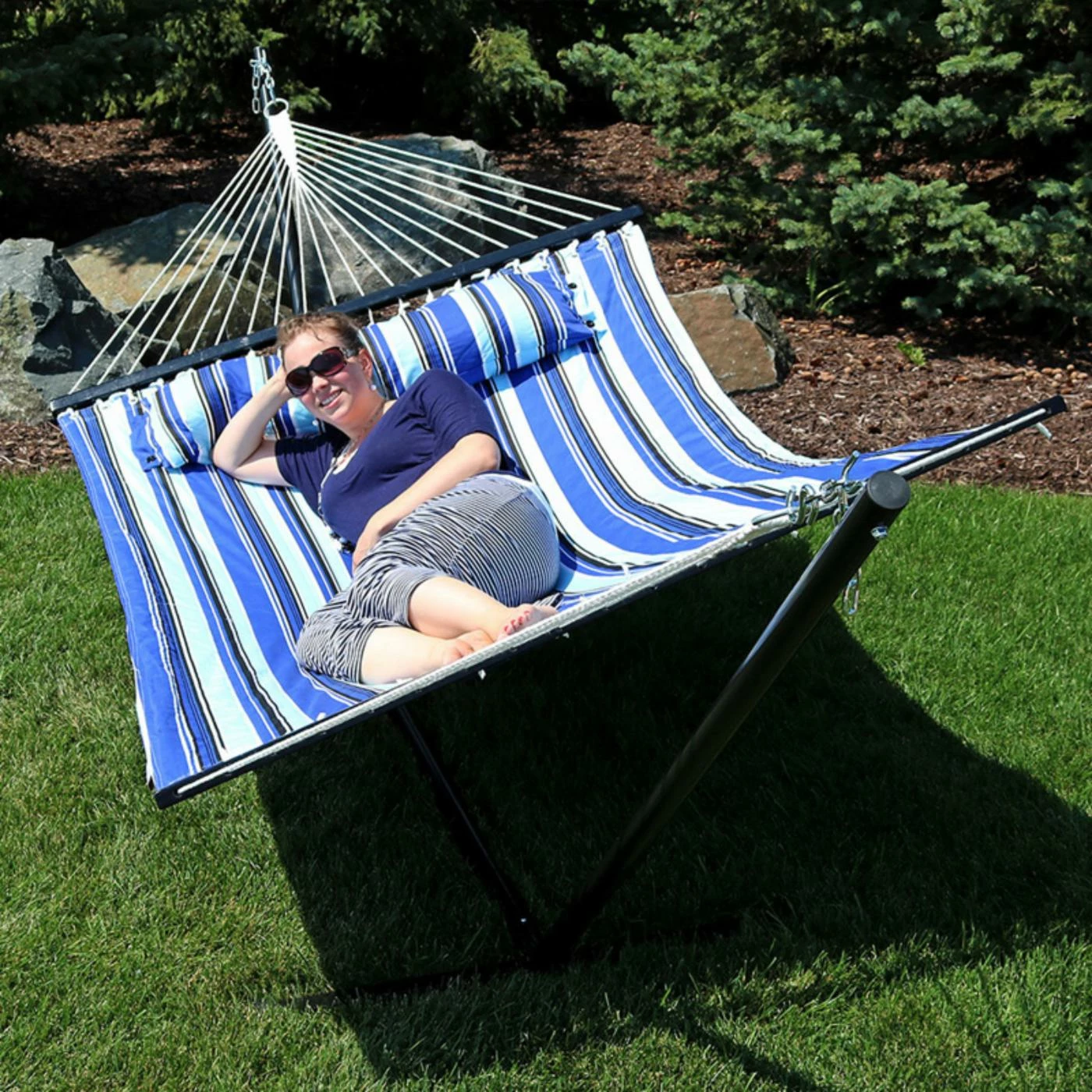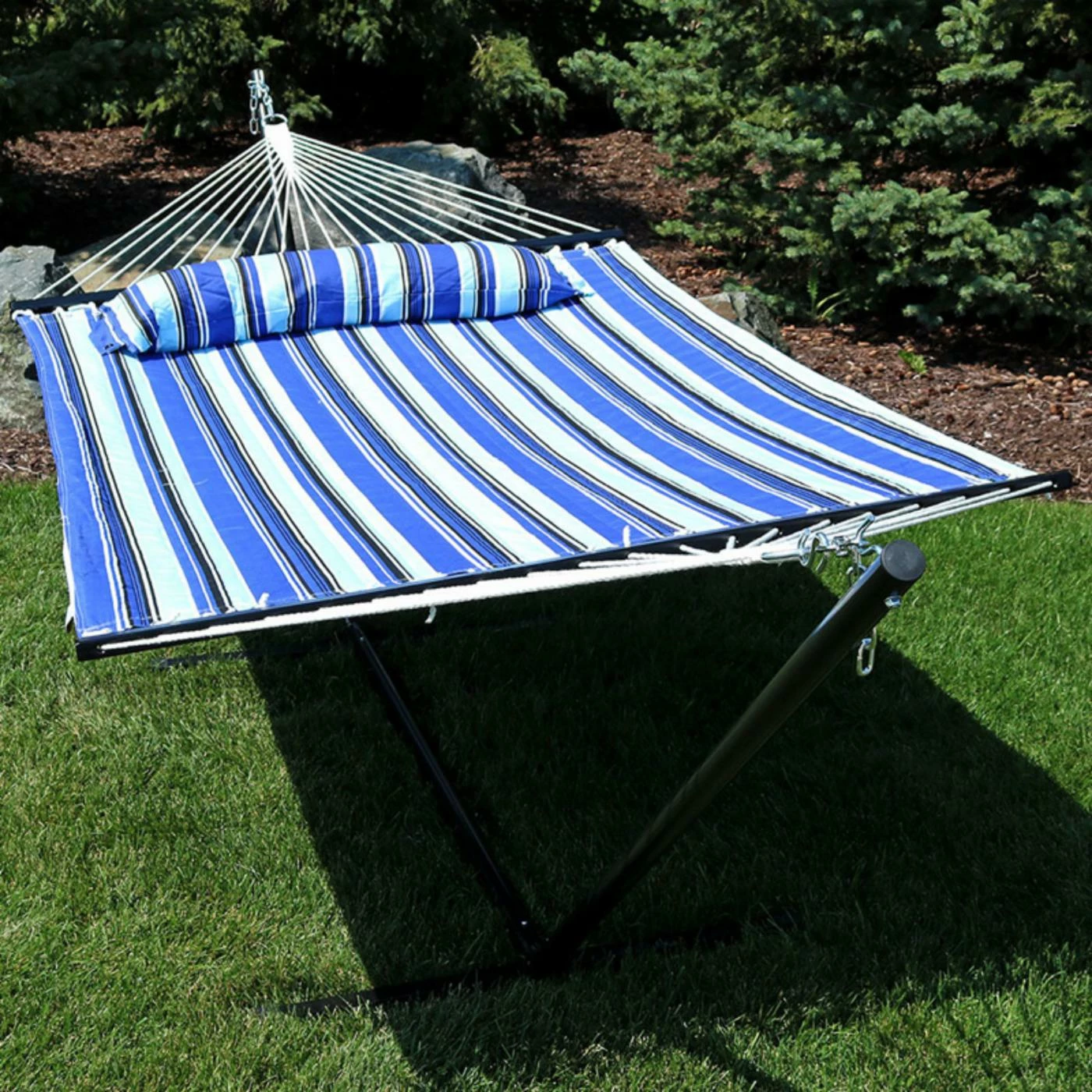 The Sunnydaze Decor Quilted 2 Person Freestanding 15 ft. Hammock with Spreader Bar and Stand brings comfort and style to your home’s outdoor setup. This polyester hammock is easily set up with the included metal stand. It’s offered in your choice of available color. It’s rated for up to 400 pounds. and can hold one or two people.