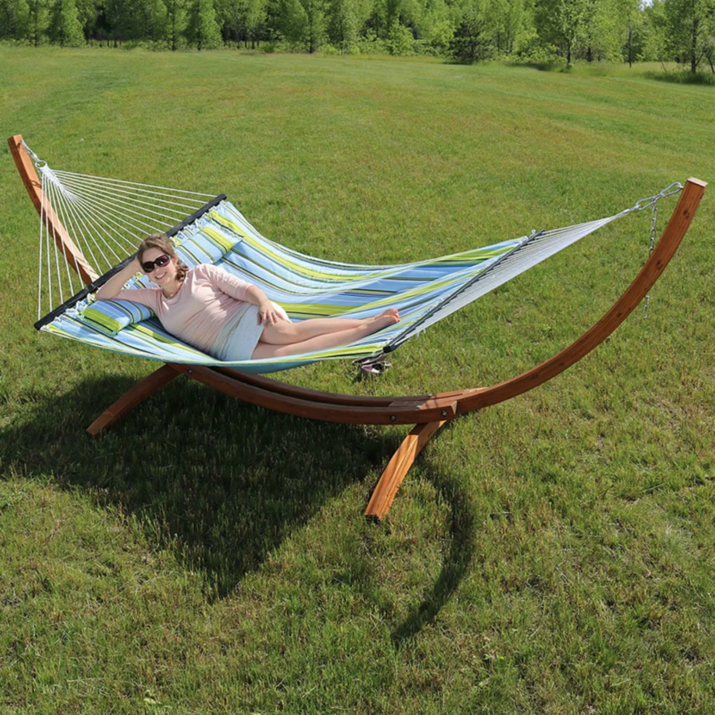 The Sunnydaze Decor Quilted Double Fabric 12 ft. Hammock with Curved Arc Wood Stand mimics a similar feeling to lounging on a comfy mattress. The soft yet durable polyester hammock is designed to seat up to two. The sturdy pine wood stand sets up anywhere outdoors. This set supports up to 440 pounds.