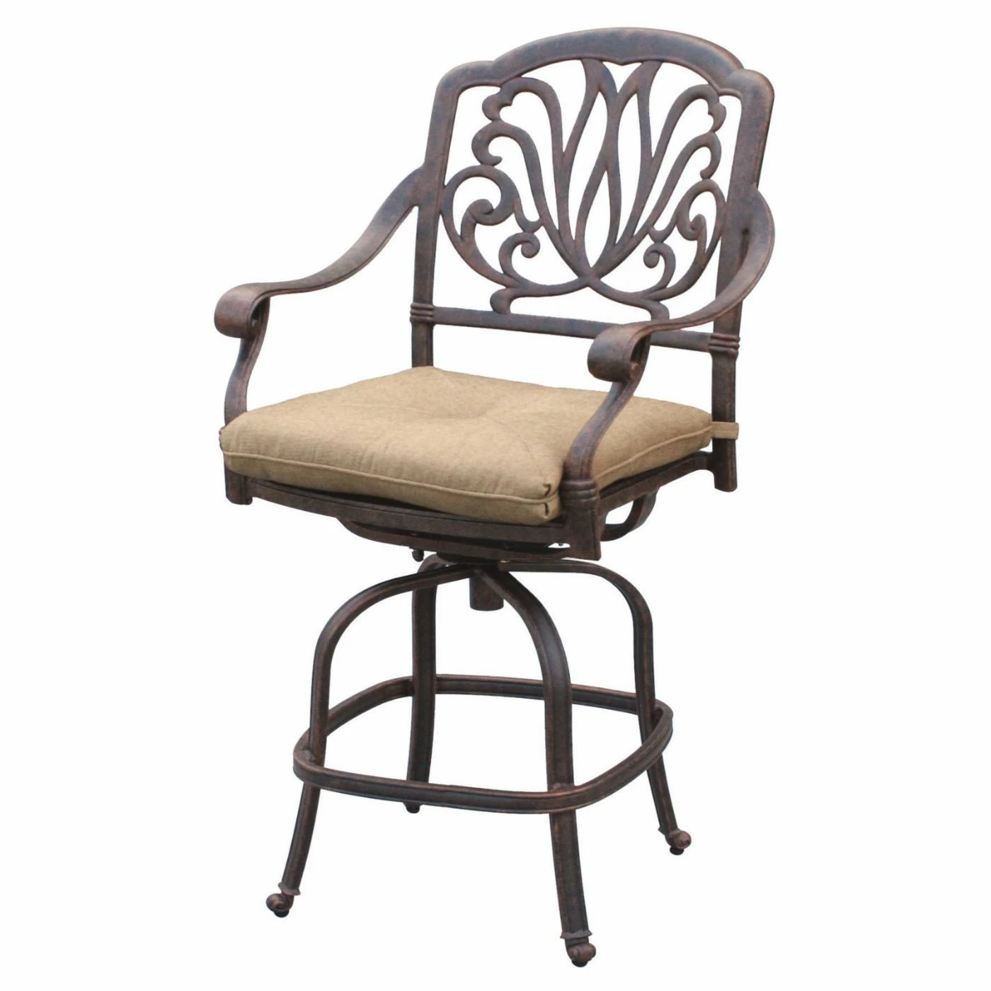 The Darlee Elisabeth Counter Height Swivel Patio Bar Stool – Set of 2 makes your outdoor living space conversation-ready. Each stool stands at counter height, includes a comfortable seat cushion, and features a smooth swiveling base. The design is crafted of cast aluminum enhanced with a hand-applied, powder-coated antique bronze finish. The gently scalloped top rail and graceful floral back and seat design add detail.