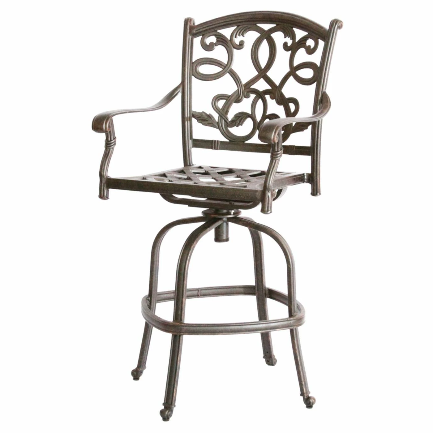 The Darlee Santa Monica Counter Height Armless Swivel Patio Bar Stool – Set of 2 is designed to make your outdoor living space all the more inviting and conversation-friendly. Each stool stands at counter height, includes a plush seat cushion, and has a smooth swiveling base so guests can move uninhibited. Their gorgeous design is made of cast aluminum with a durable powder-coated antique bronze finish that plays wonderfully on the graceful scrolling vine back design. The armless stool is topped by a neutral sesame fabric seat cushion that includes handy ties to keep them in place when the wind rises.